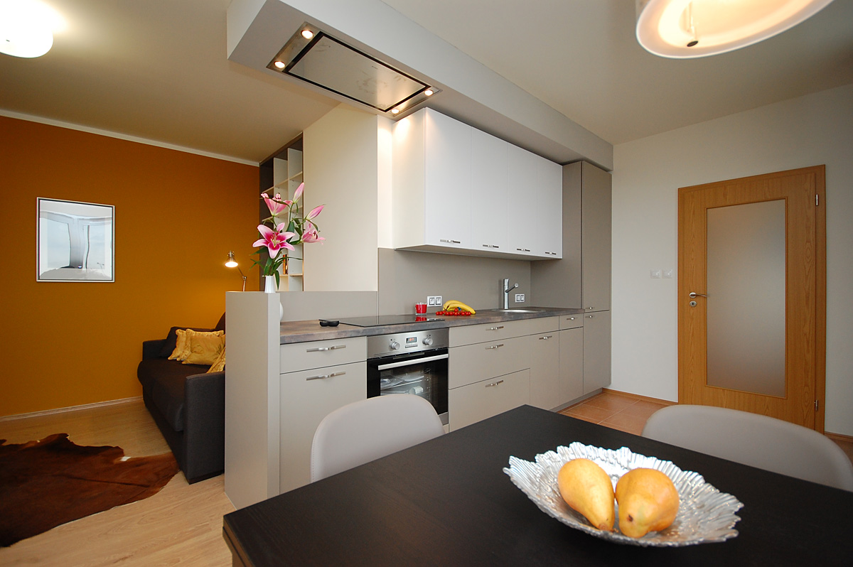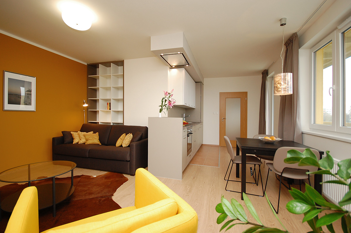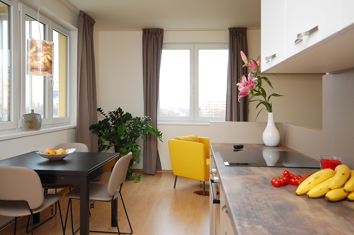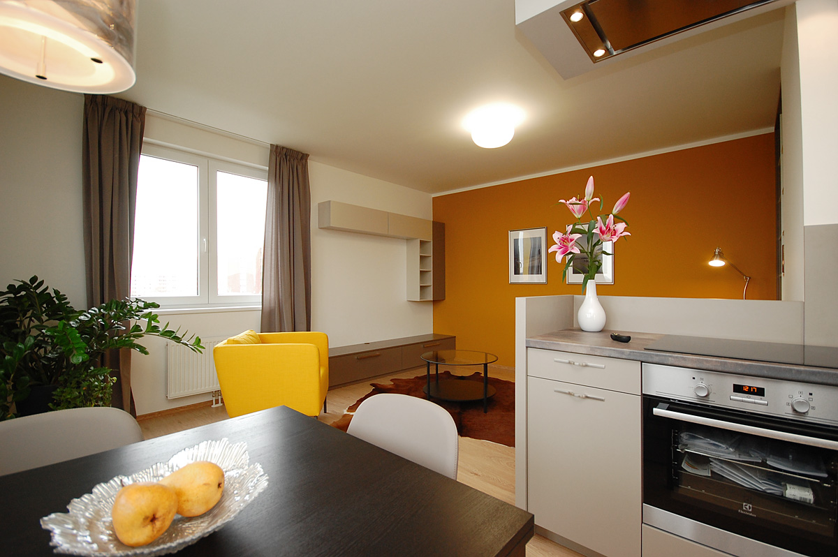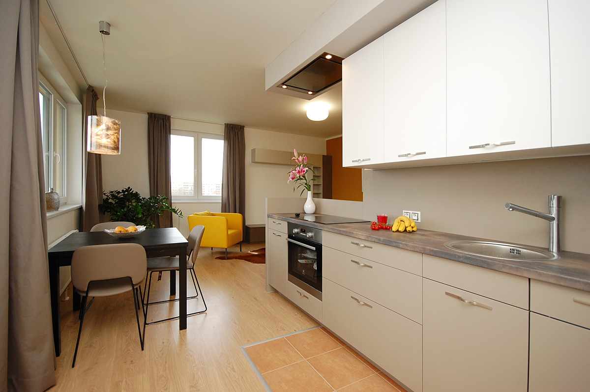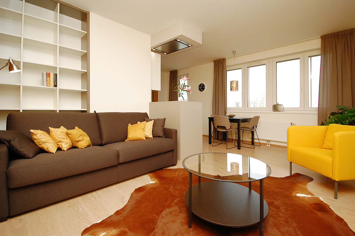 A new apartment in Prague's Prosek district was furnished for rent to a discerning tenant. The floors, tiles, and bathroom were original. It was therefore necessary to color-coordinate the interior to respect the already installed materials. We atypically extended the kitchen into the space in a single line and concealed a fold-out sofa with a full-sized mattress behind it. We integrated the extractor hood into the plasterboard suspended ceiling, which visually separates the kitchen from the living area. The striking mustard color on the living room wall and the cowhide rug on the floor are notable features.