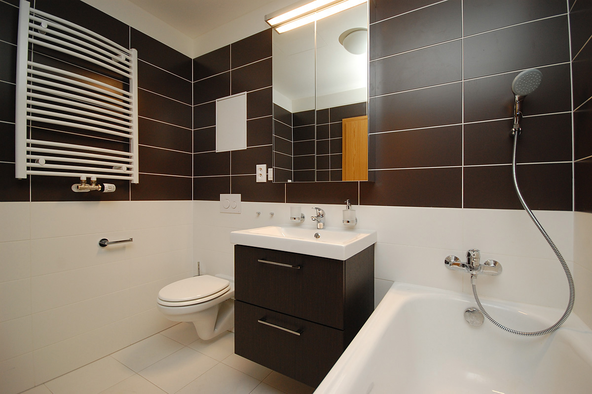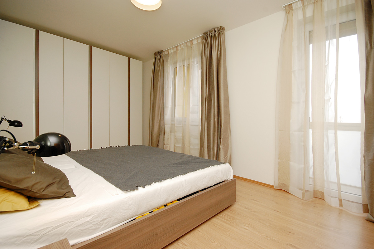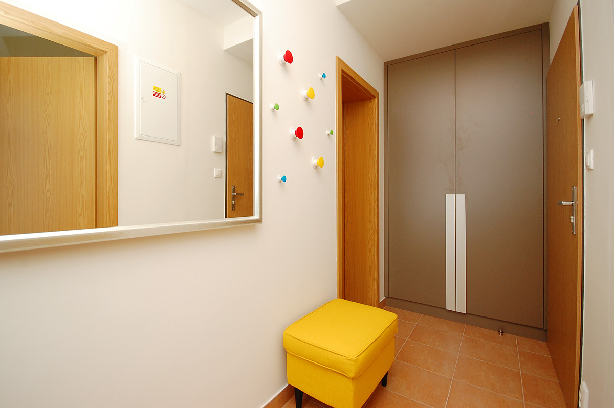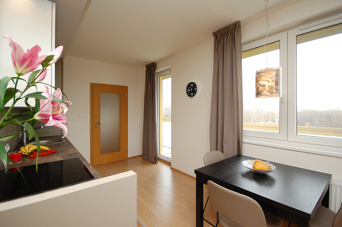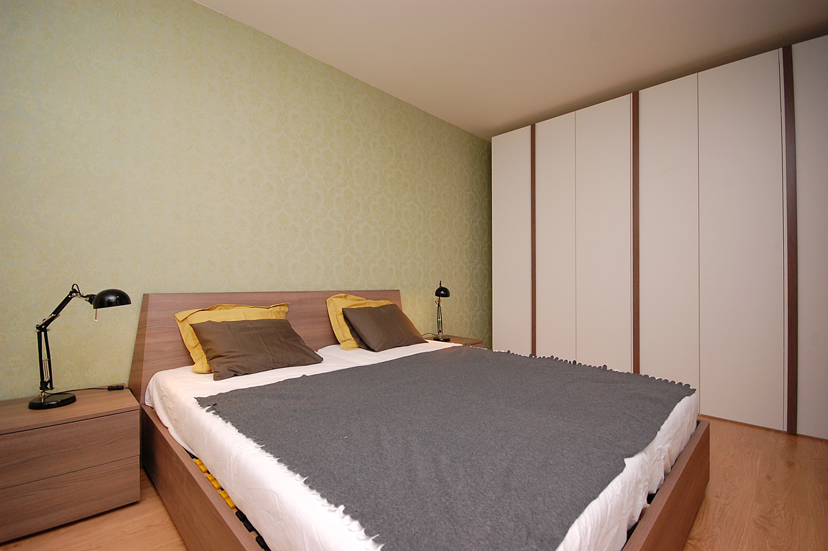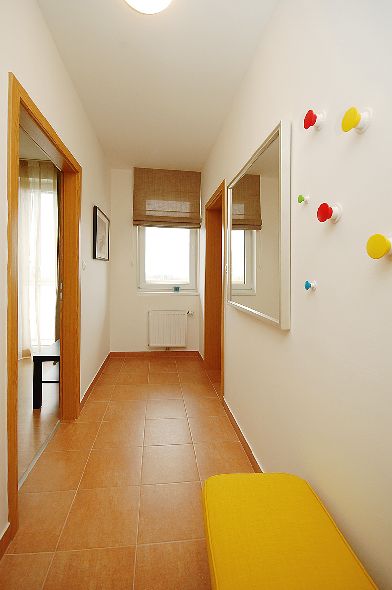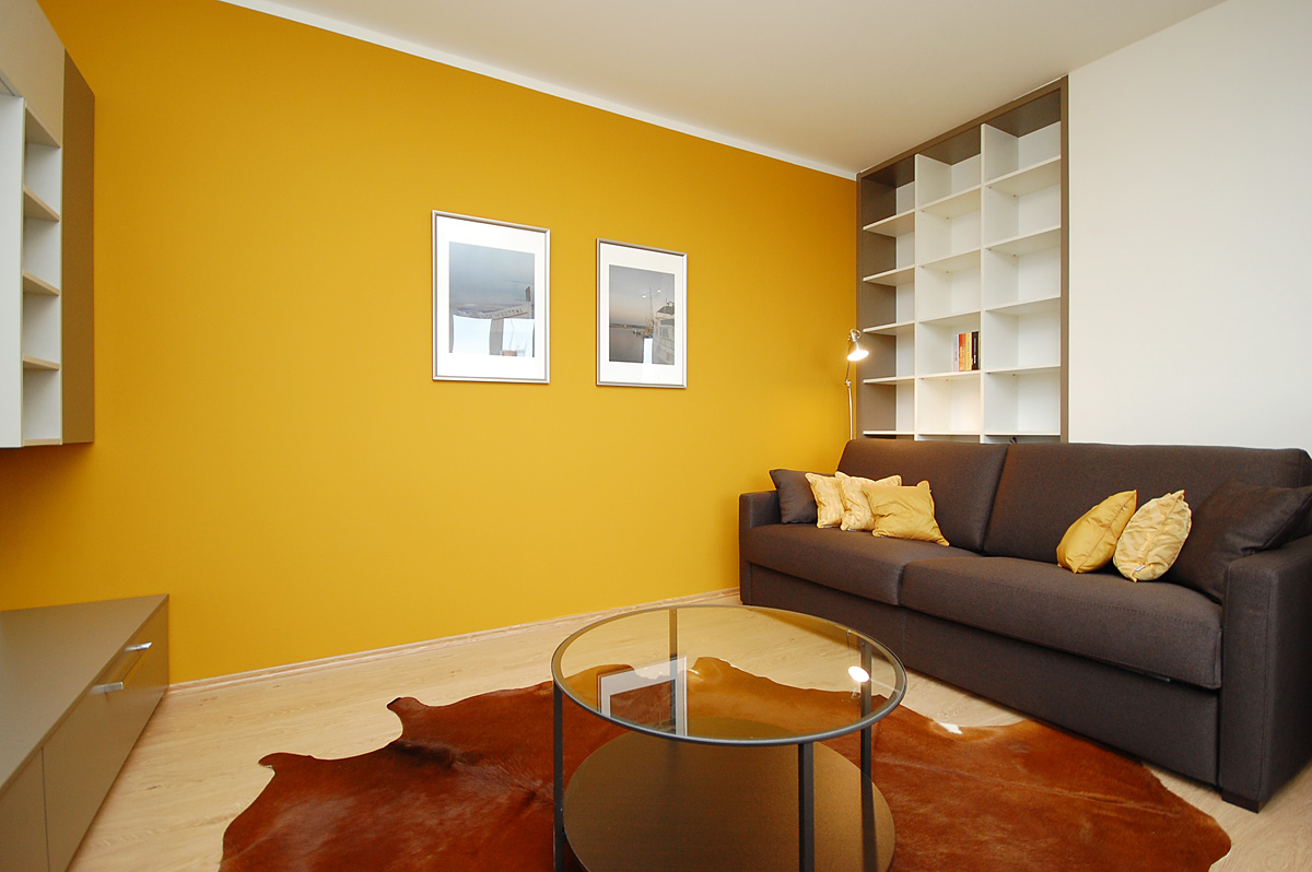 A new apartment in Prague's Prosek district was furnished for rent to a discerning tenant. The floors, tiles, and bathroom were original. It was therefore necessary to color-coordinate the interior to respect the already installed materials. We atypically extended the kitchen into the space in a single line and concealed a fold-out sofa with a full-sized mattress behind it. We integrated the extractor hood into the plasterboard suspended ceiling, which visually separates the kitchen from the living area. The striking mustard color on the living room wall and the cowhide rug on the floor are notable features.