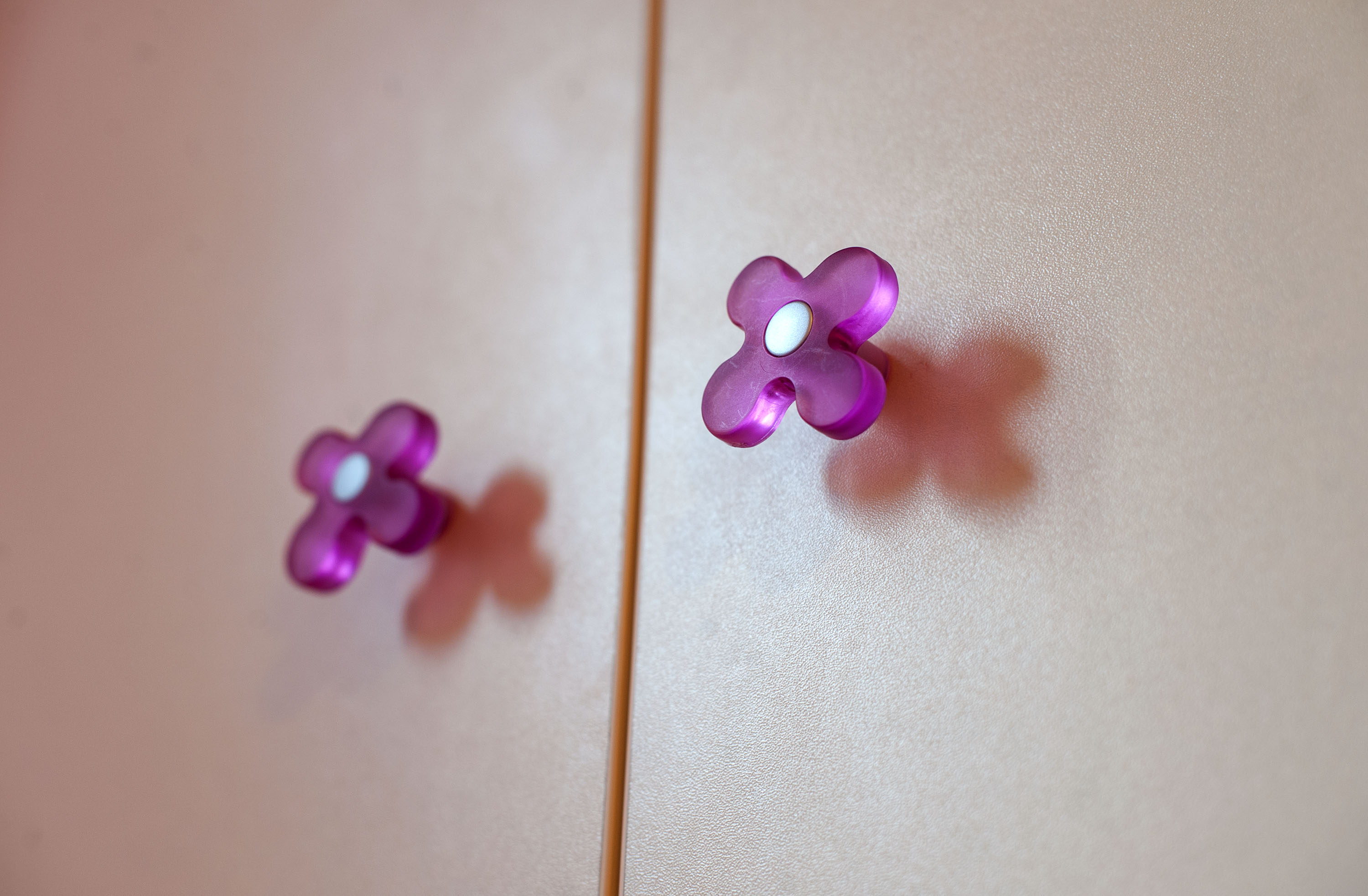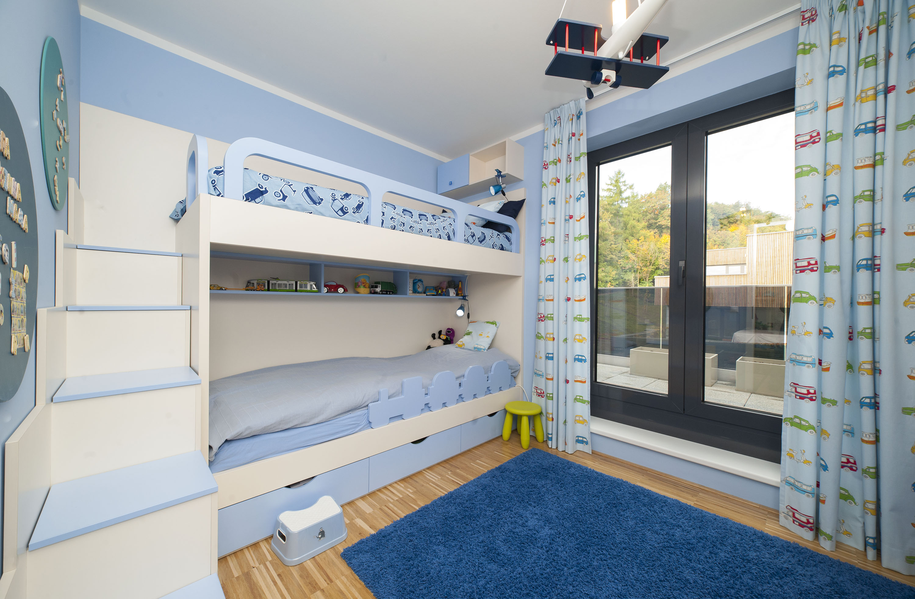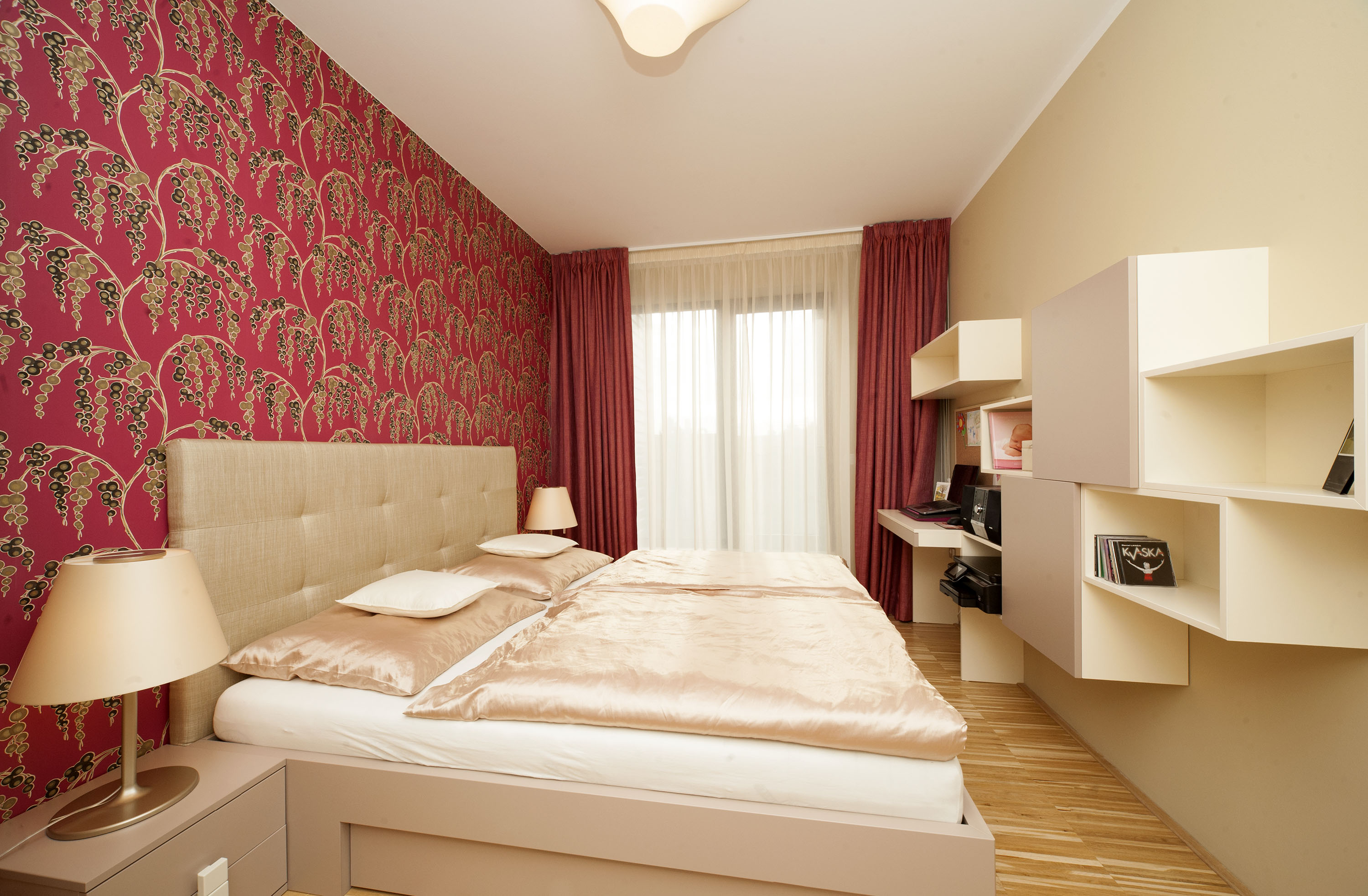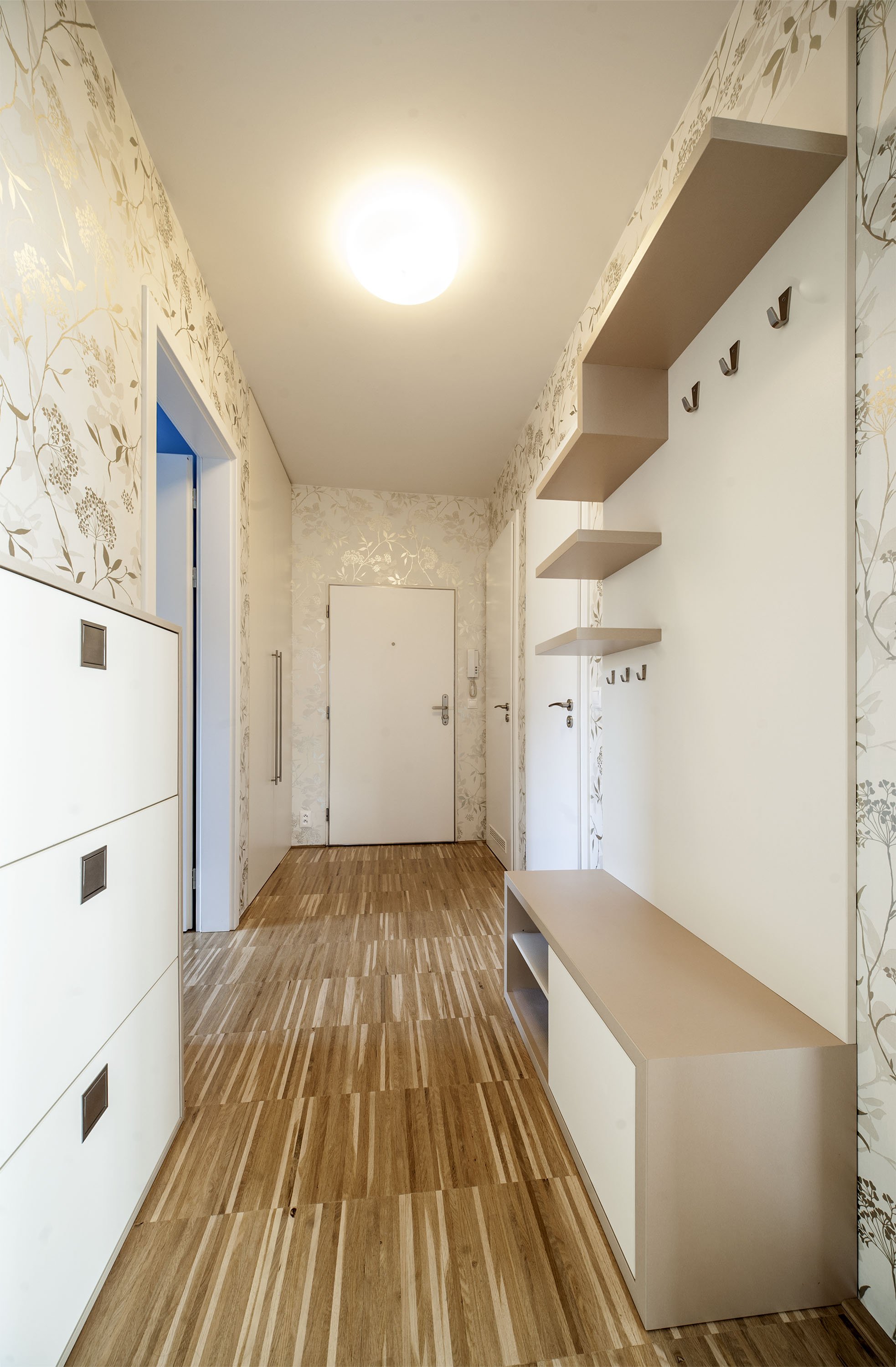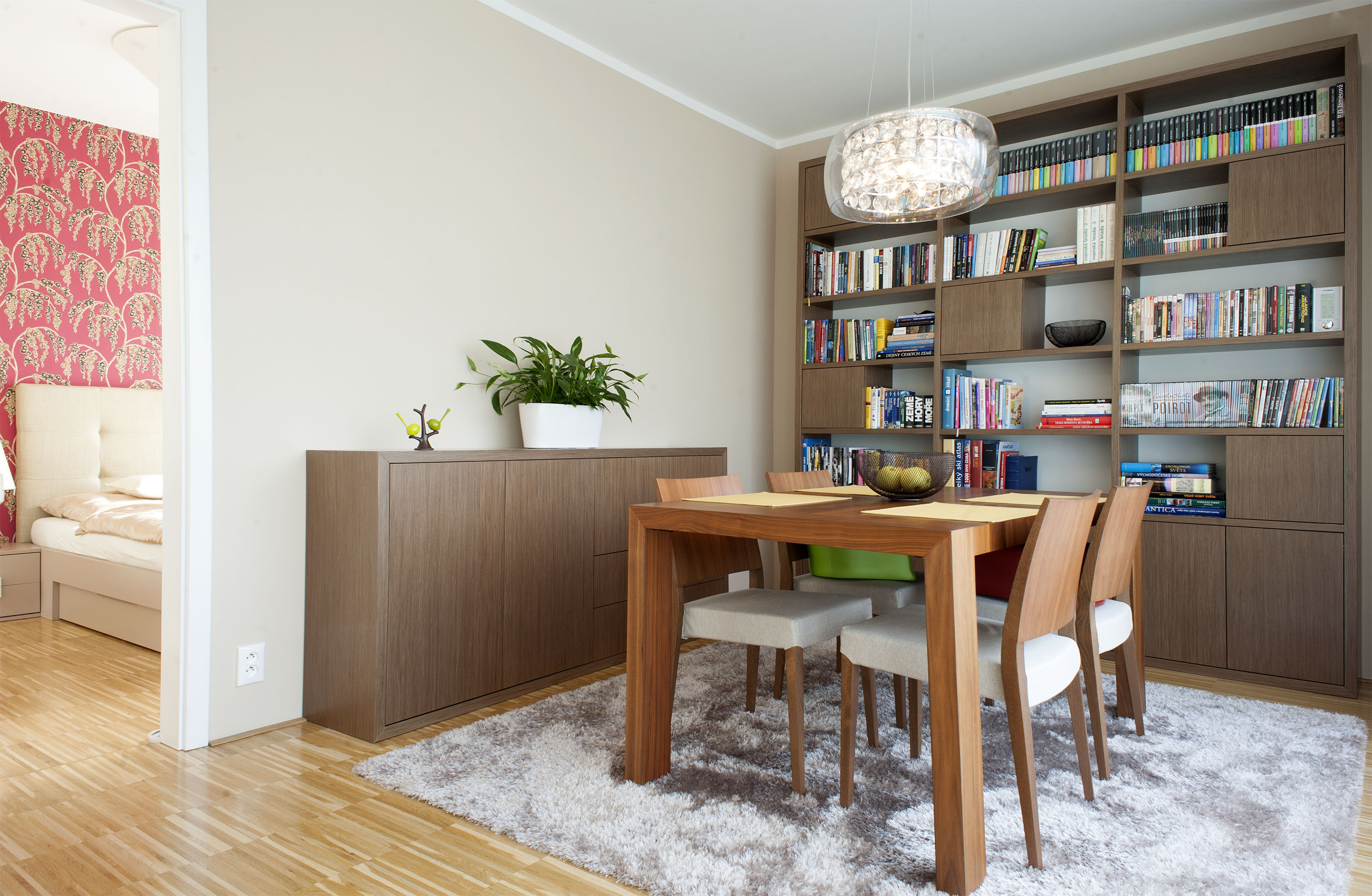 Newly constructed block of flats, flat for a family with two children, most of the furniture was custom-made, children's bedrooms in pastel colours, down-to-earth living room in walnut veneer and colourful bedroom with a work desk, accent on details and accessories, wallpaper matching with curtains, interesting lamps.