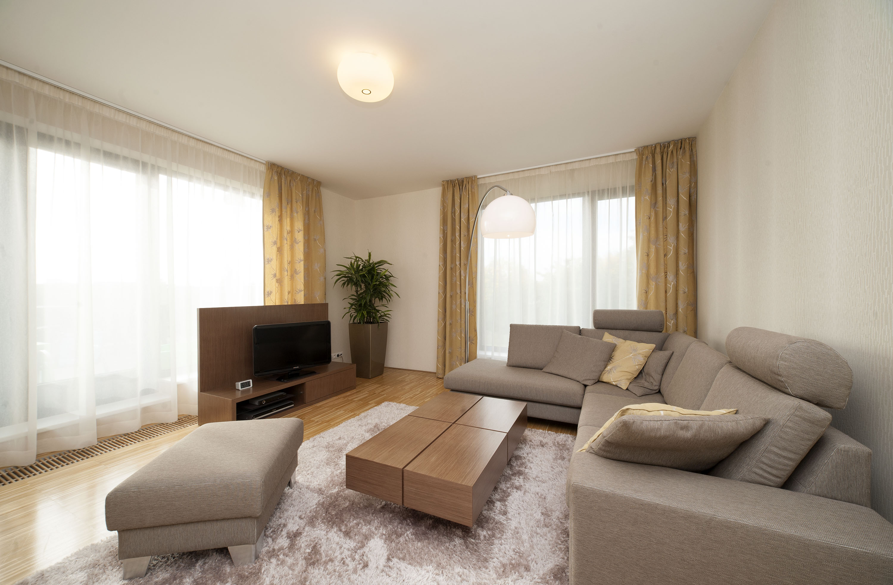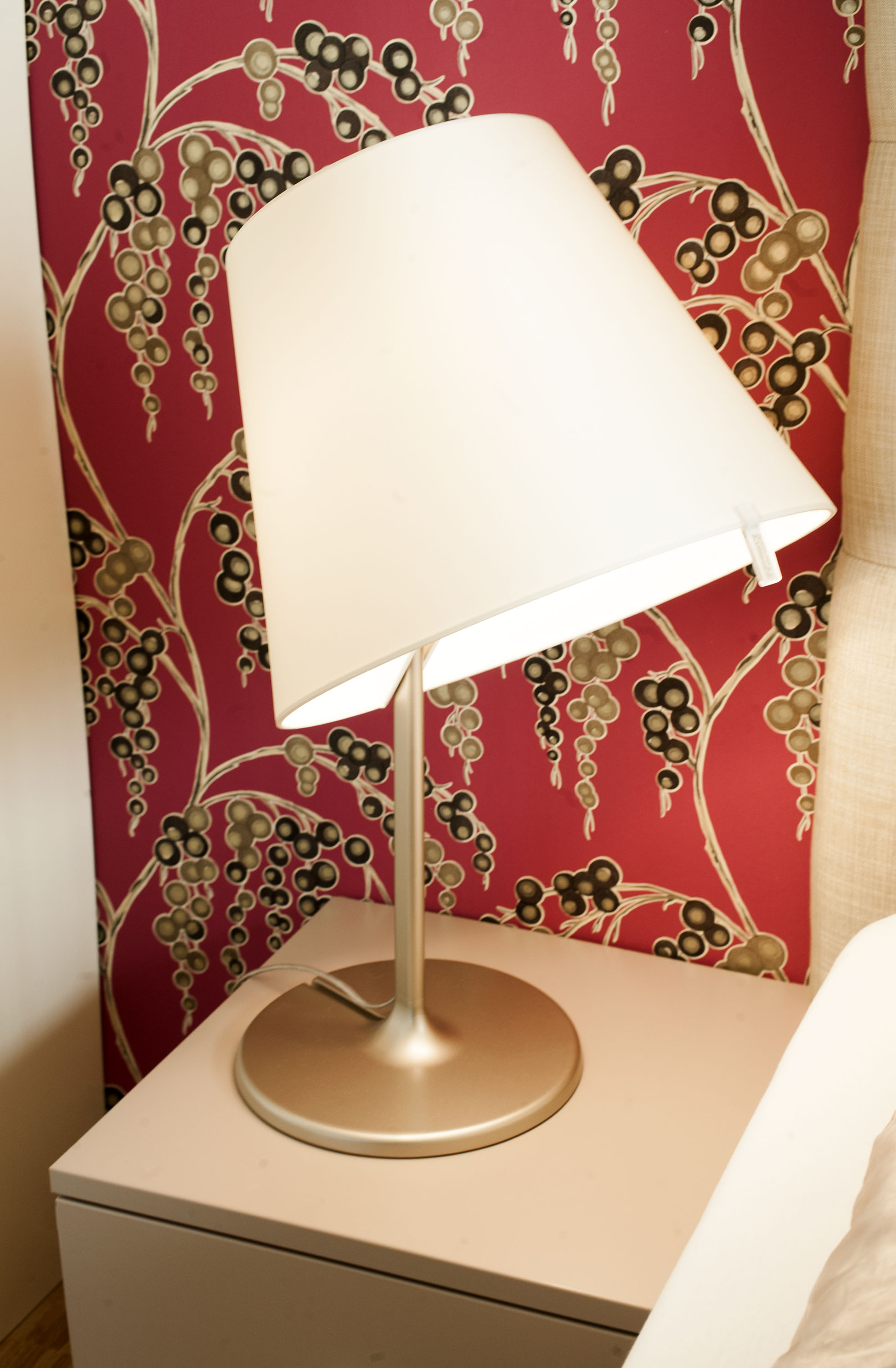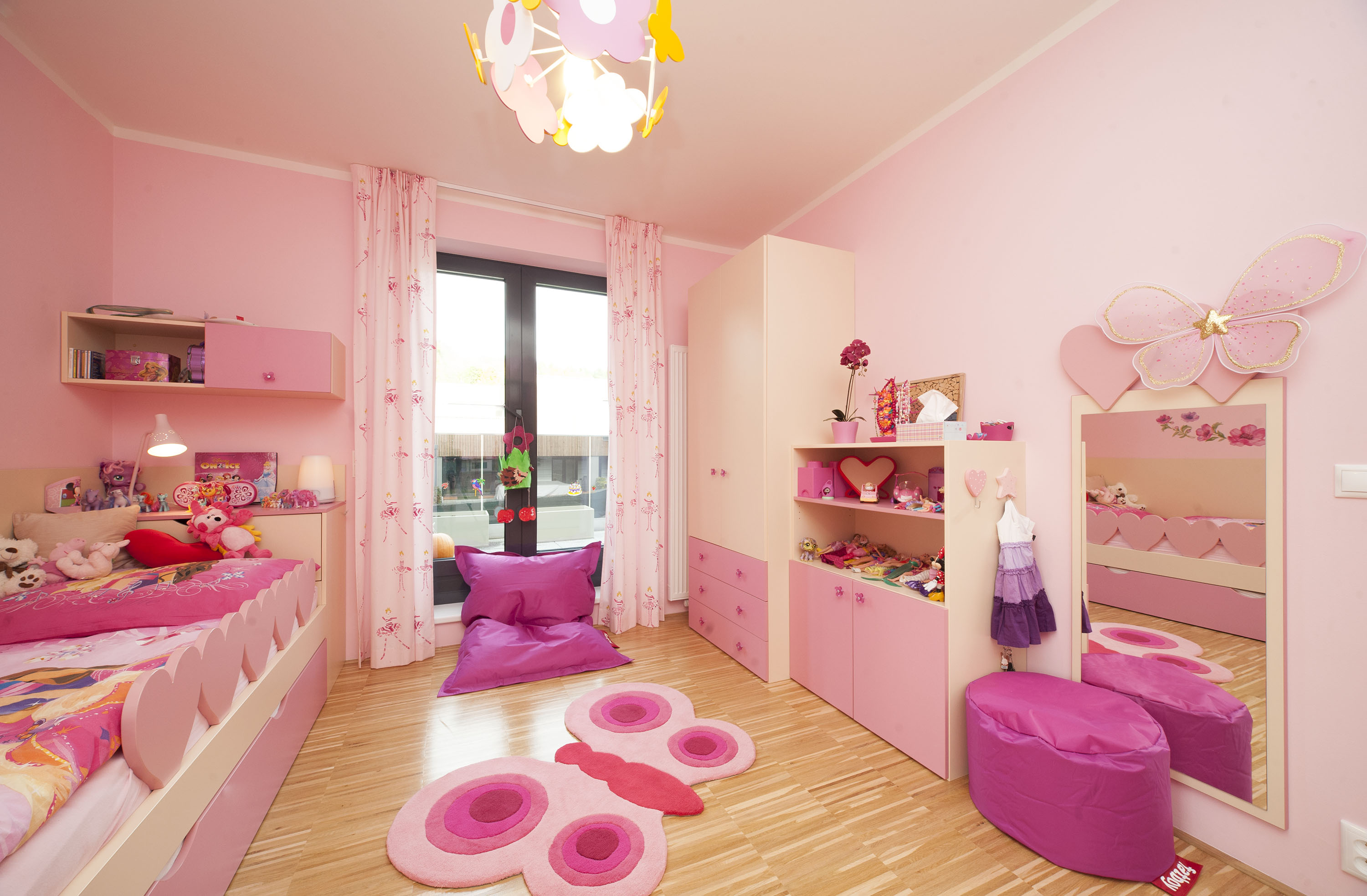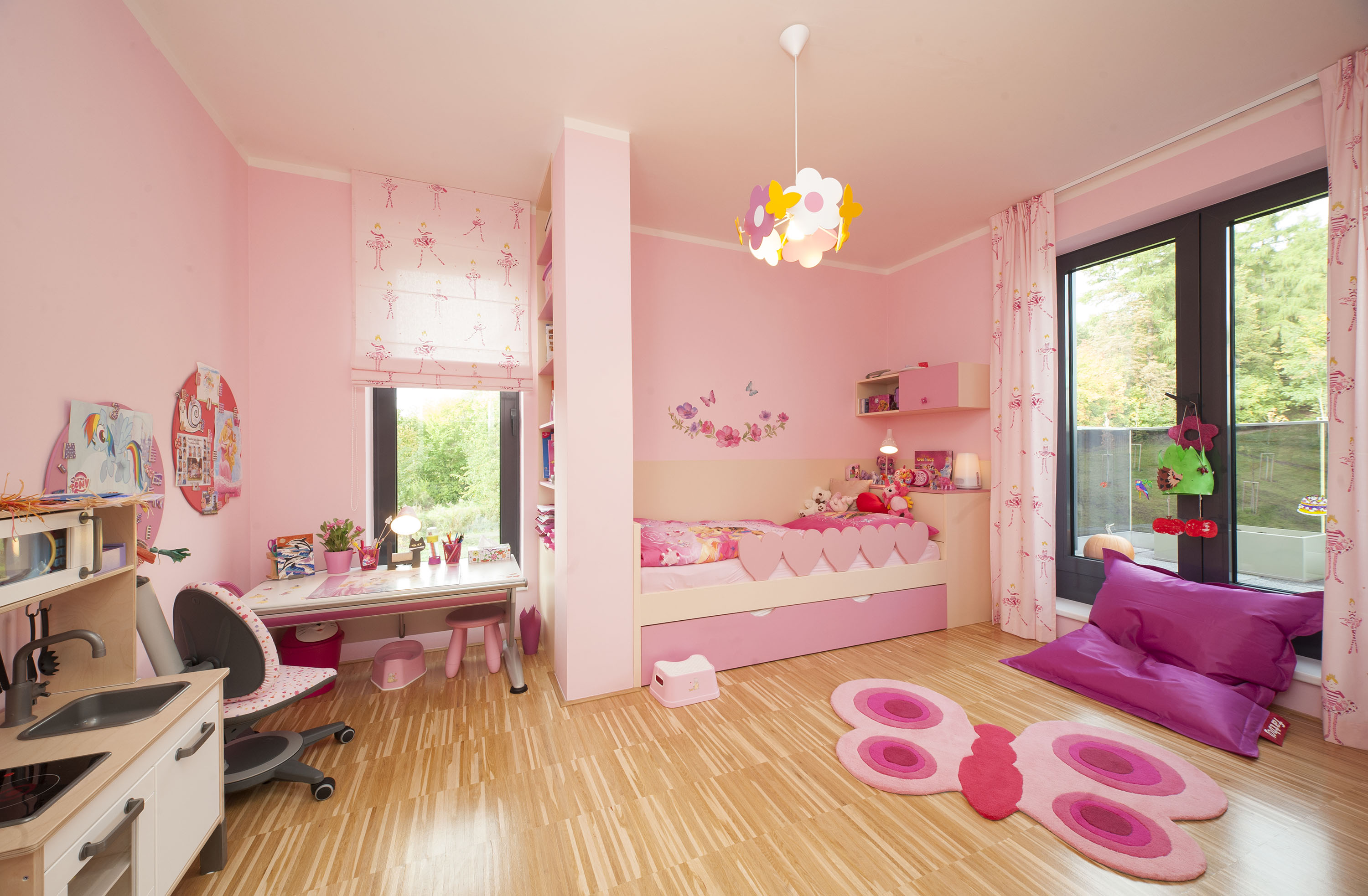 Newly constructed block of flats, flat for a family with two children, most of the furniture was custom-made, children's bedrooms in pastel colours, down-to-earth living room in walnut veneer and colourful bedroom with a work desk, accent on details and accessories, wallpaper matching with curtains, interesting lamps.