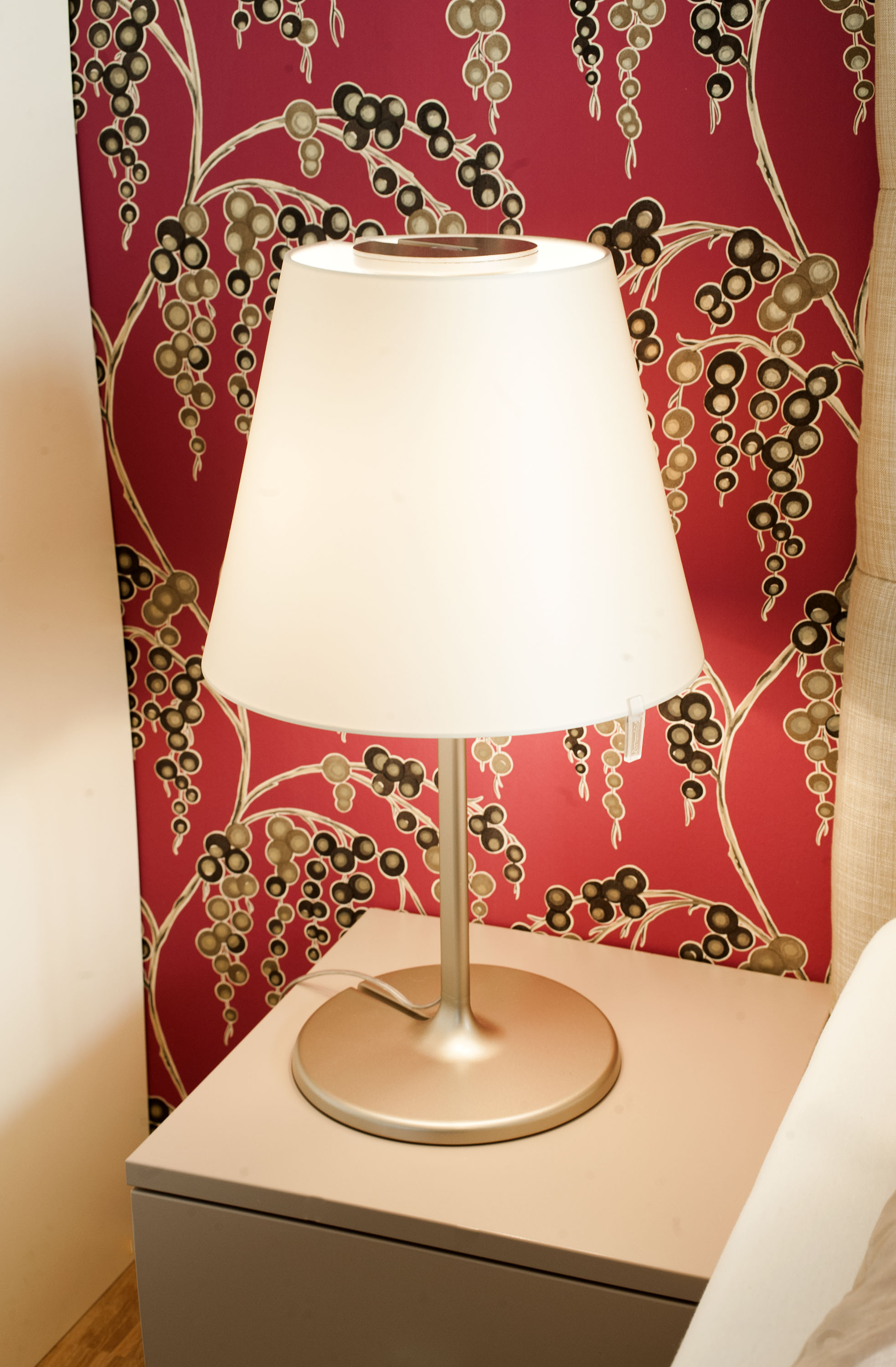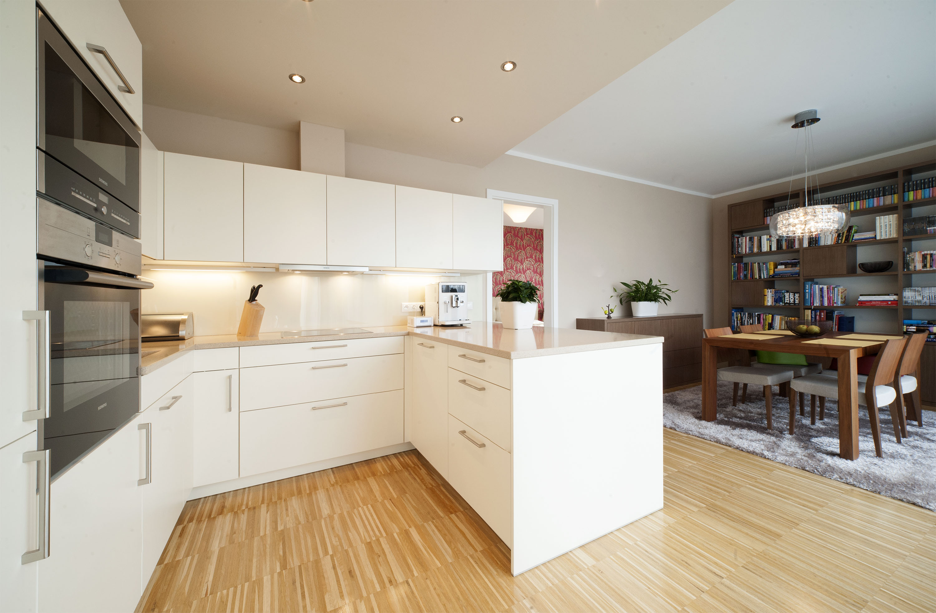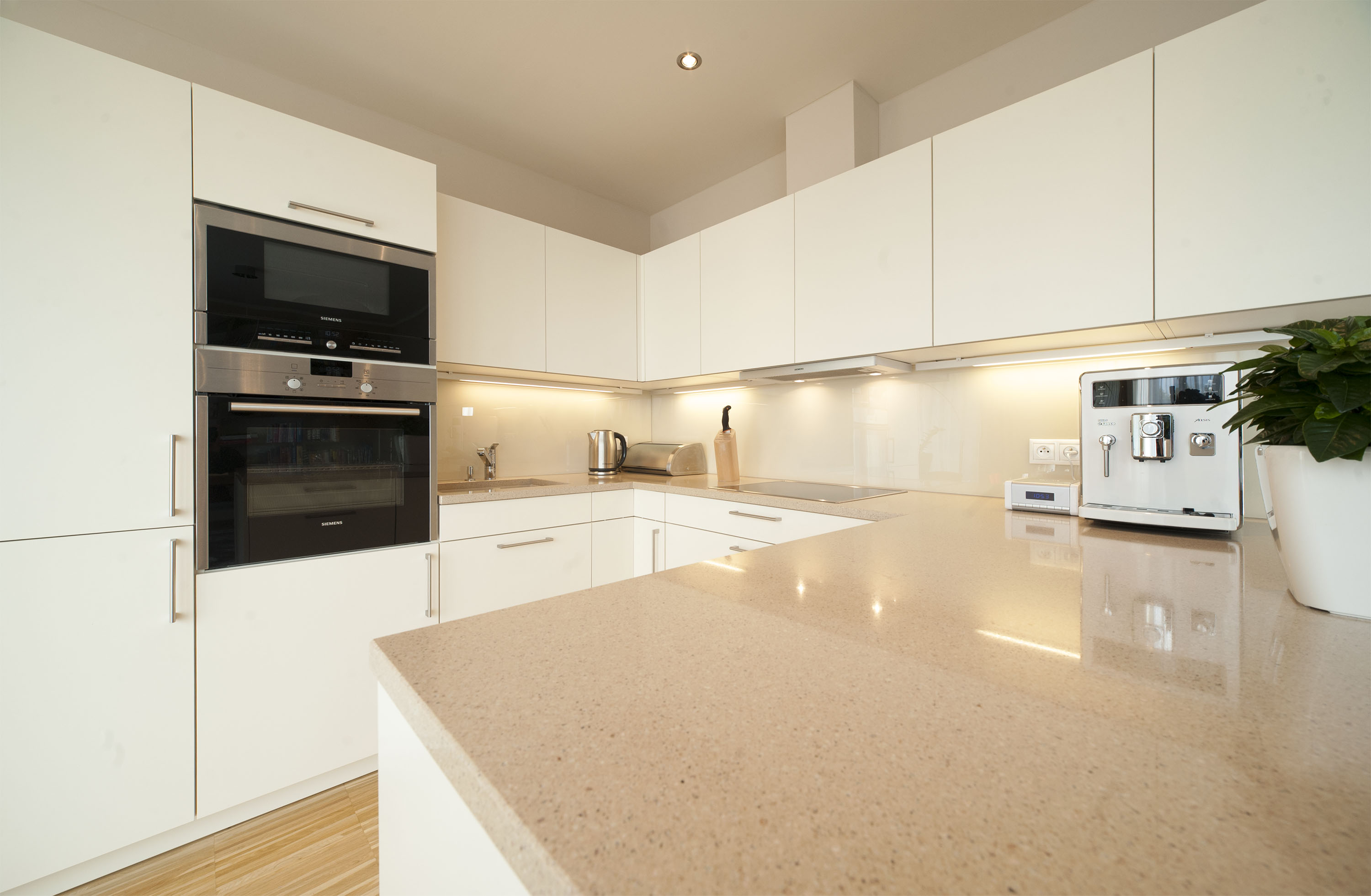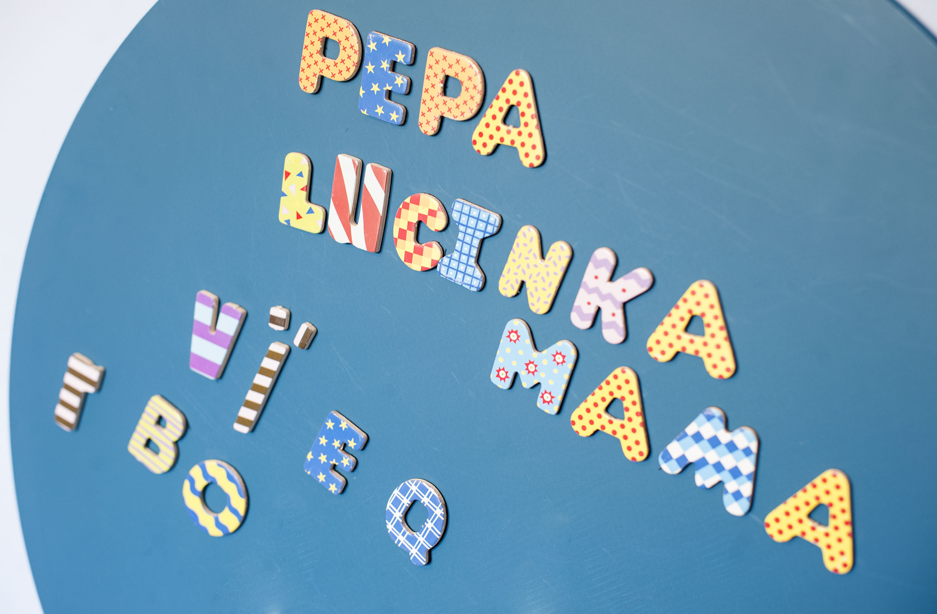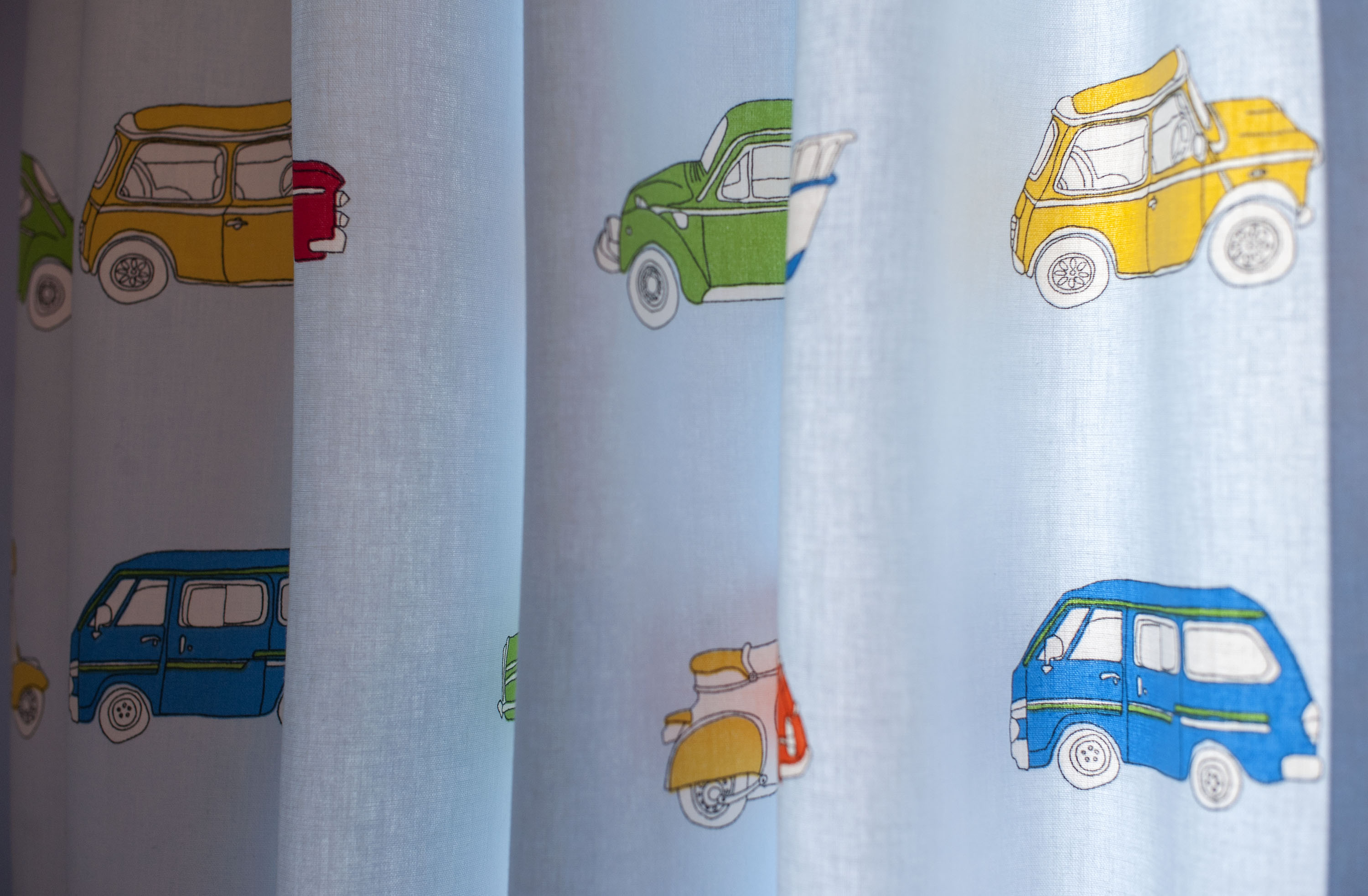 Newly constructed block of flats, flat for a family with two children, most of the furniture was custom-made, children's bedrooms in pastel colours, down-to-earth living room in walnut veneer and colourful bedroom with a work desk, accent on details and accessories, wallpaper matching with curtains, interesting lamps.