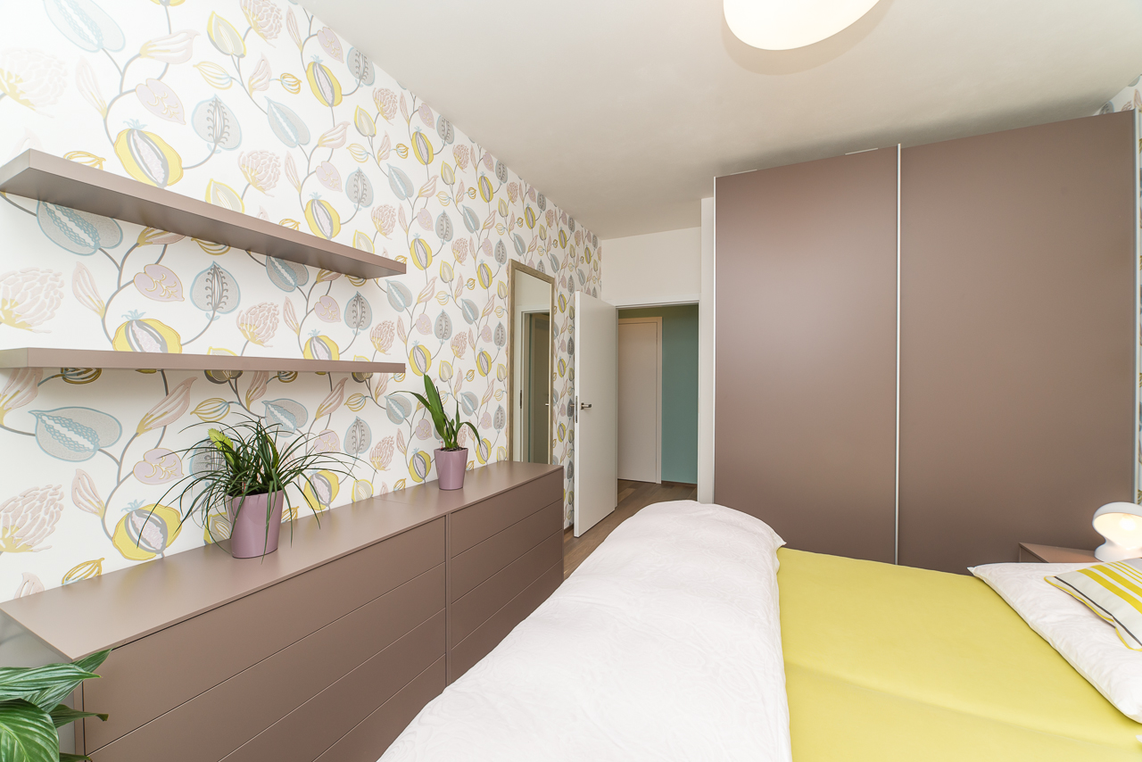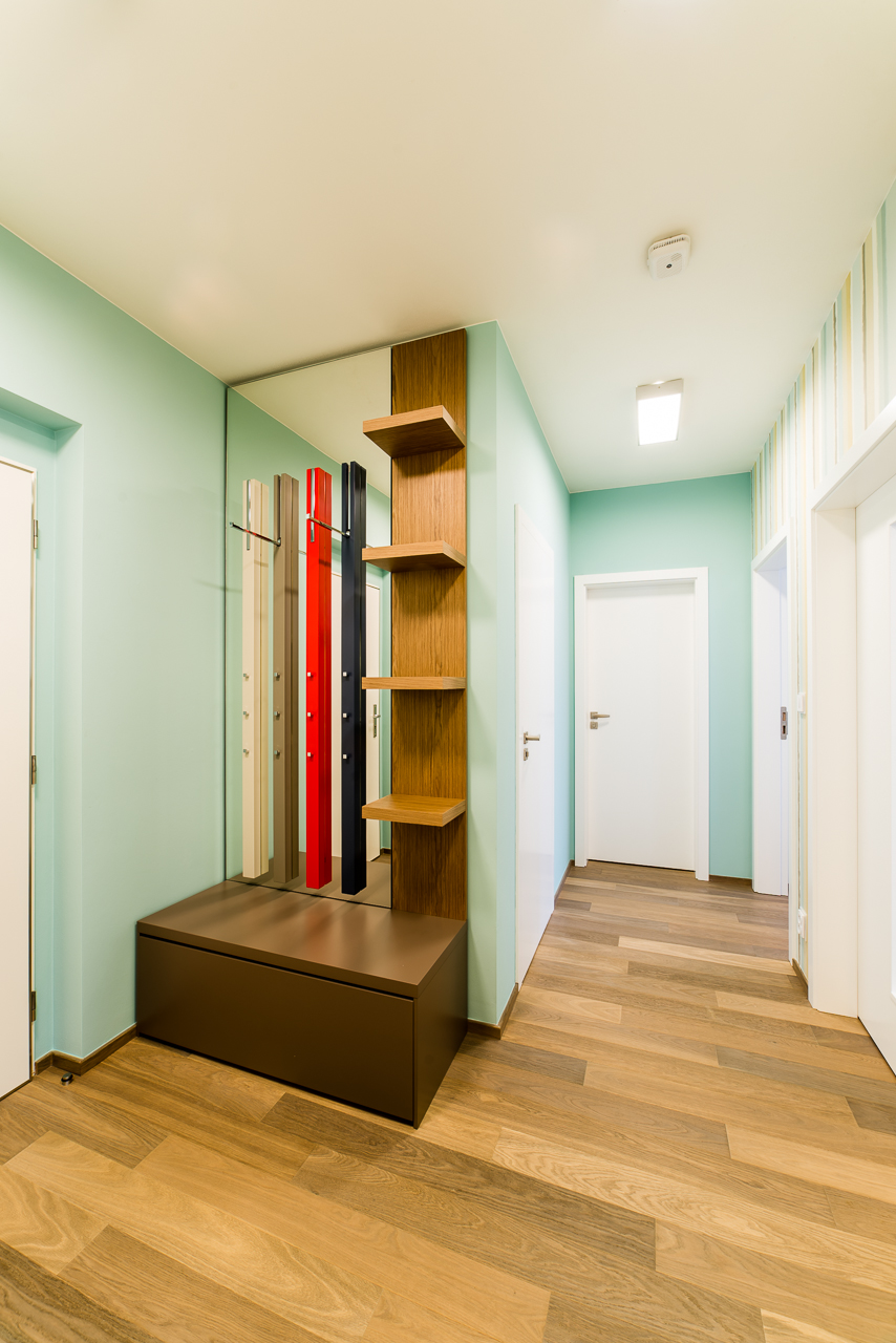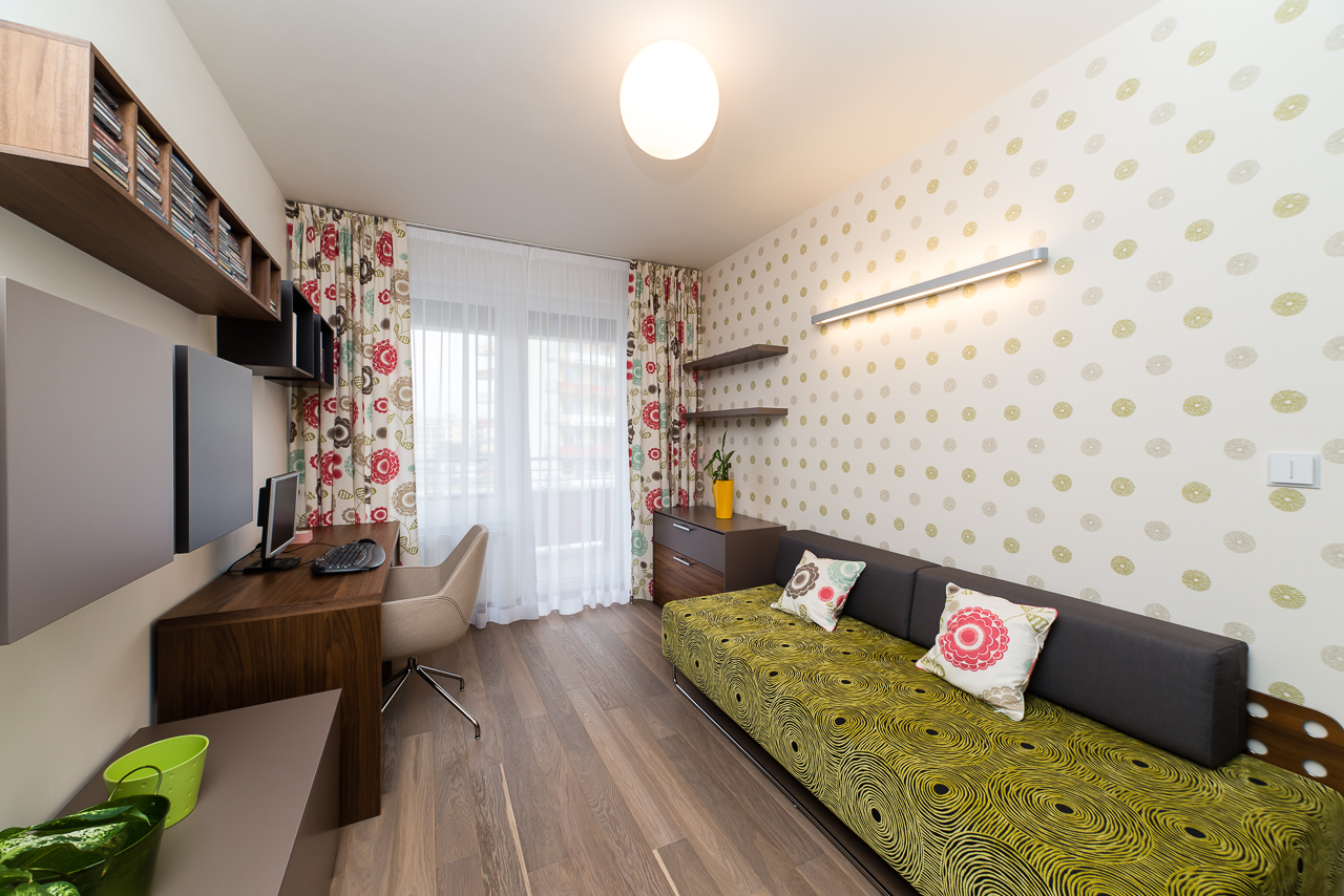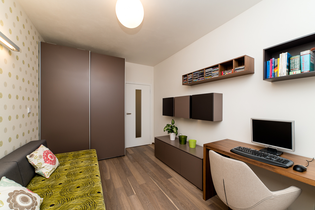 The apartment is in a development project in Prague. The client approached us when it was necessary to select and decide on floor coverings and the design of interior doors. We modified the layout of the electrical installations based on the overall concept of furniture placement. The basic requirement was the use of more intense colors, which the client likes. For the floor, we therefore used oak in a grayish shade, which allowed us to use distinct pigments on the walls and furniture. In the kitchen and living room, mustard plays a key role, light blue in the hallway, green in the study, and violet in the bedroom. We used wallpapers and textiles from our favorite brand Harlequin, and the MOMO fold-out sofa from the Czech manufacturer Polstrin was utilized in the study.