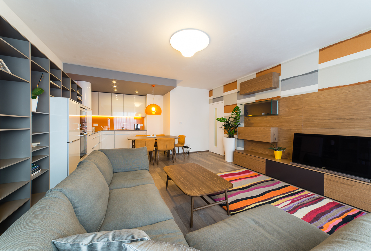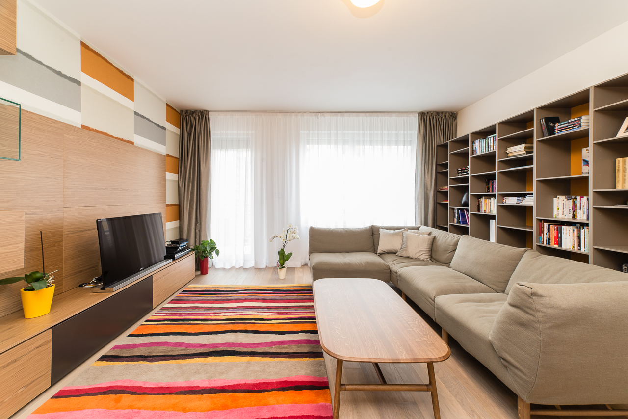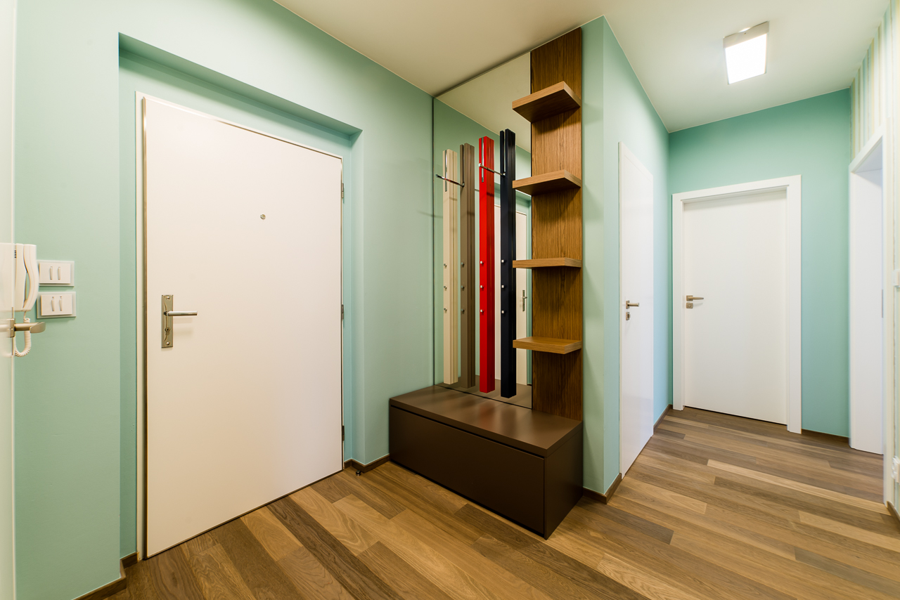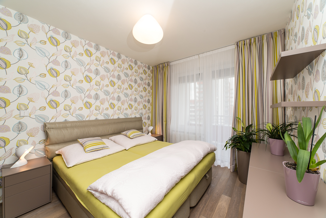 The apartment is in a development project in Prague. The client approached us when it was necessary to select and decide on floor coverings and the design of interior doors. We modified the layout of the electrical installations based on the overall concept of furniture placement. The basic requirement was the use of more intense colors, which the client likes. For the floor, we therefore used oak in a grayish shade, which allowed us to use distinct pigments on the walls and furniture. In the kitchen and living room, mustard plays a key role, light blue in the hallway, green in the study, and violet in the bedroom. We used wallpapers and textiles from our favorite brand Harlequin, and the MOMO fold-out sofa from the Czech manufacturer Polstrin was utilized in the study.
