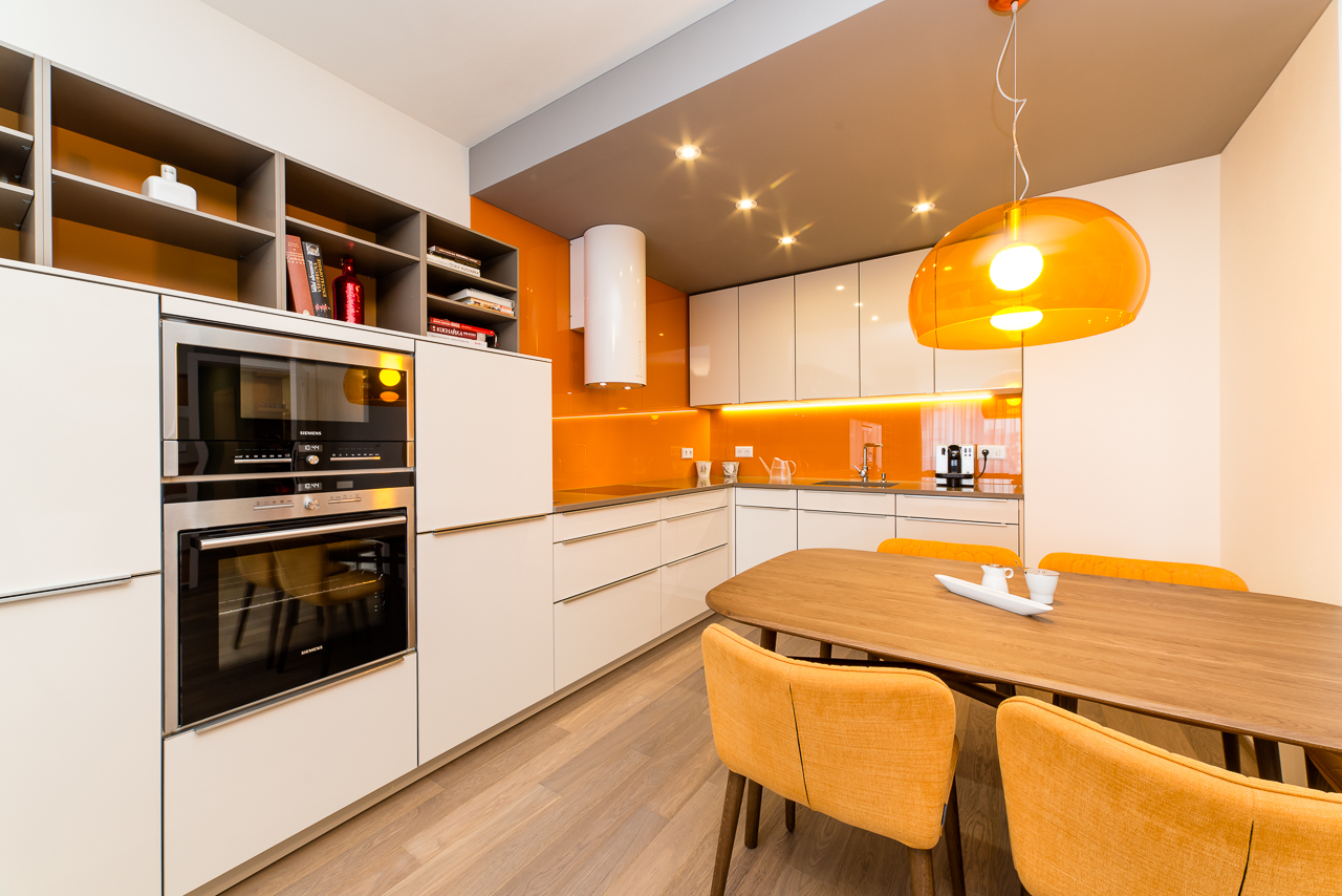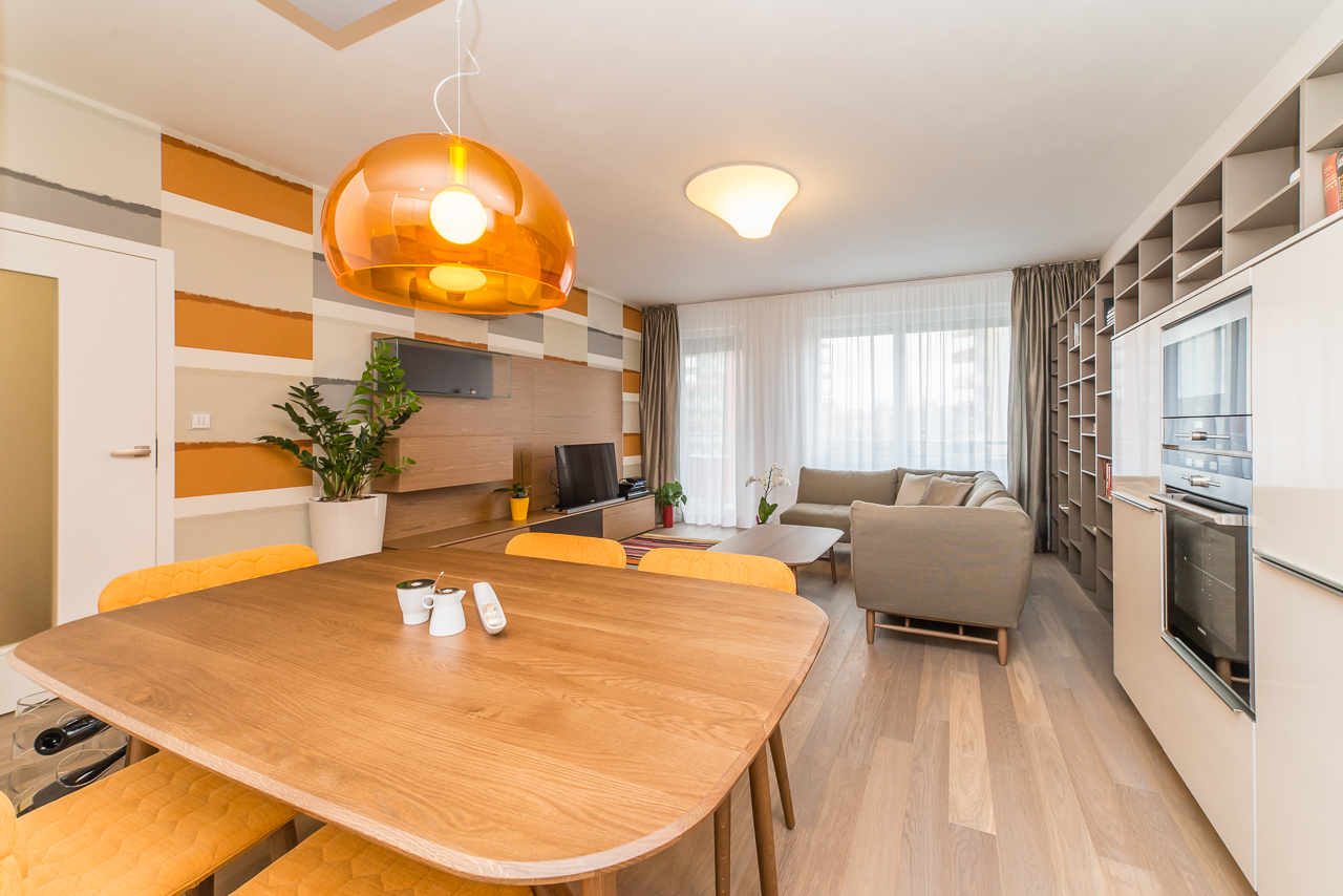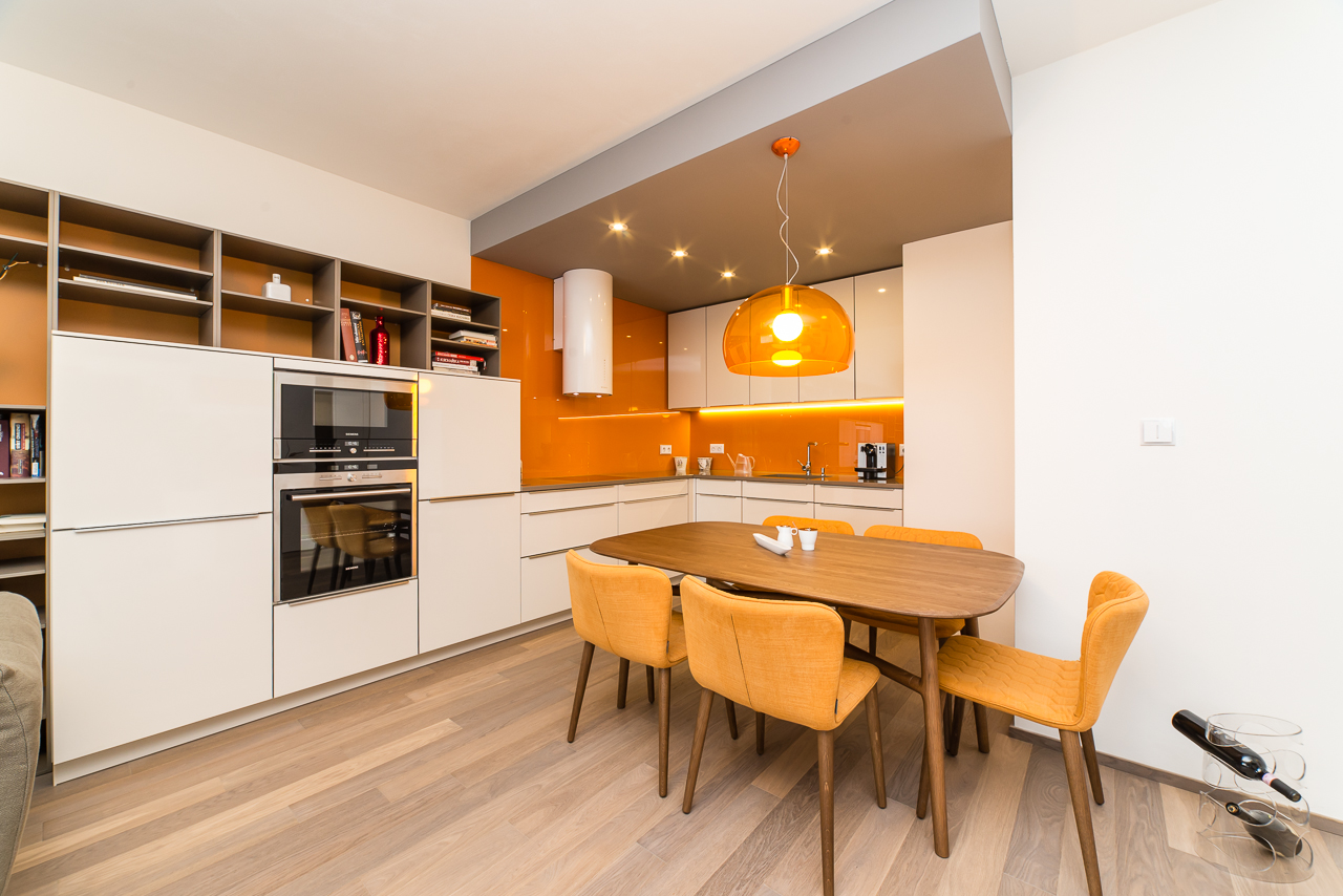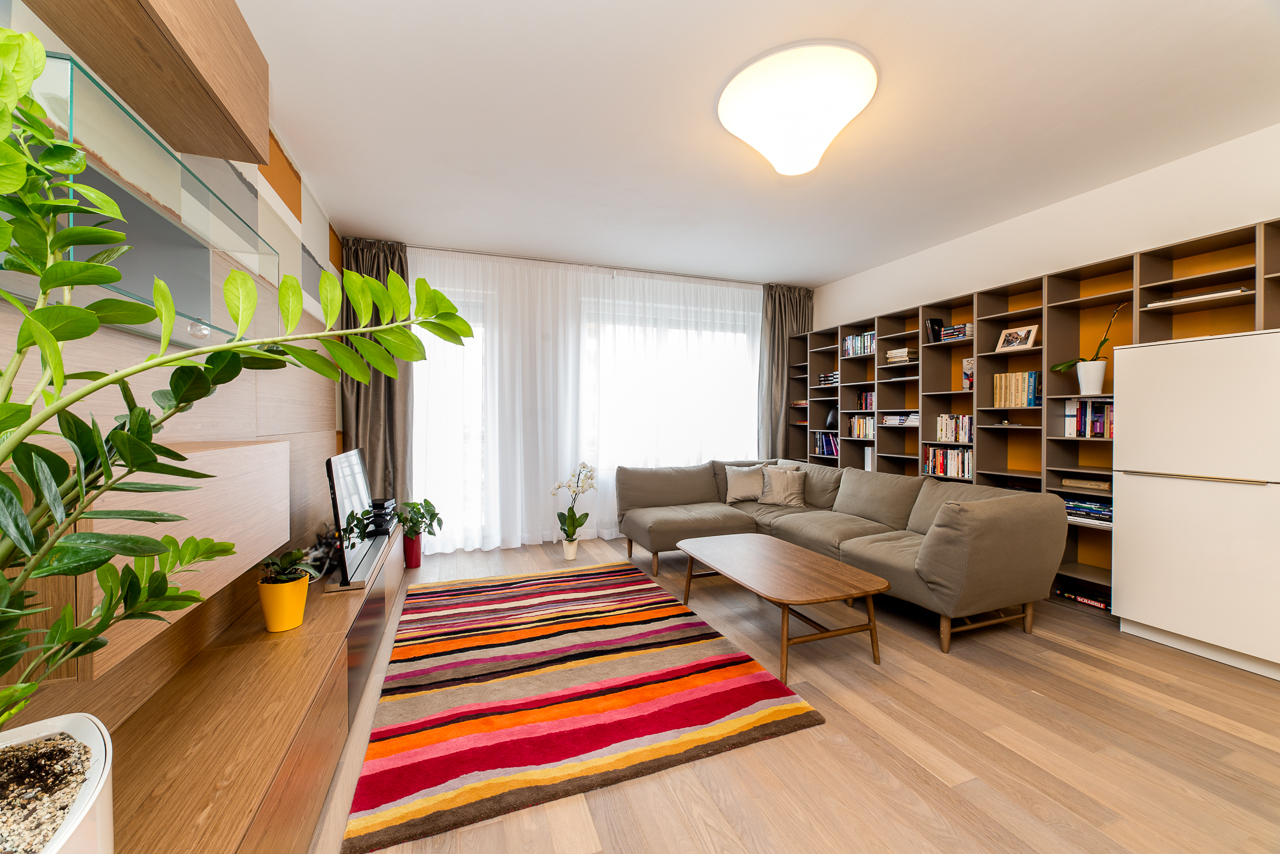 The apartment is in a development project in Prague. The client approached us when it was necessary to select and decide on floor coverings and the design of interior doors. We modified the layout of the electrical installations based on the overall concept of furniture placement. The basic requirement was the use of more intense colors, which the client likes. For the floor, we therefore used oak in a grayish shade, which allowed us to use distinct pigments on the walls and furniture. In the kitchen and living room, mustard plays a key role, light blue in the hallway, green in the study, and violet in the bedroom. We used wallpapers and textiles from our favorite brand Harlequin, and the MOMO fold-out sofa from the Czech manufacturer Polstrin was utilized in the study.