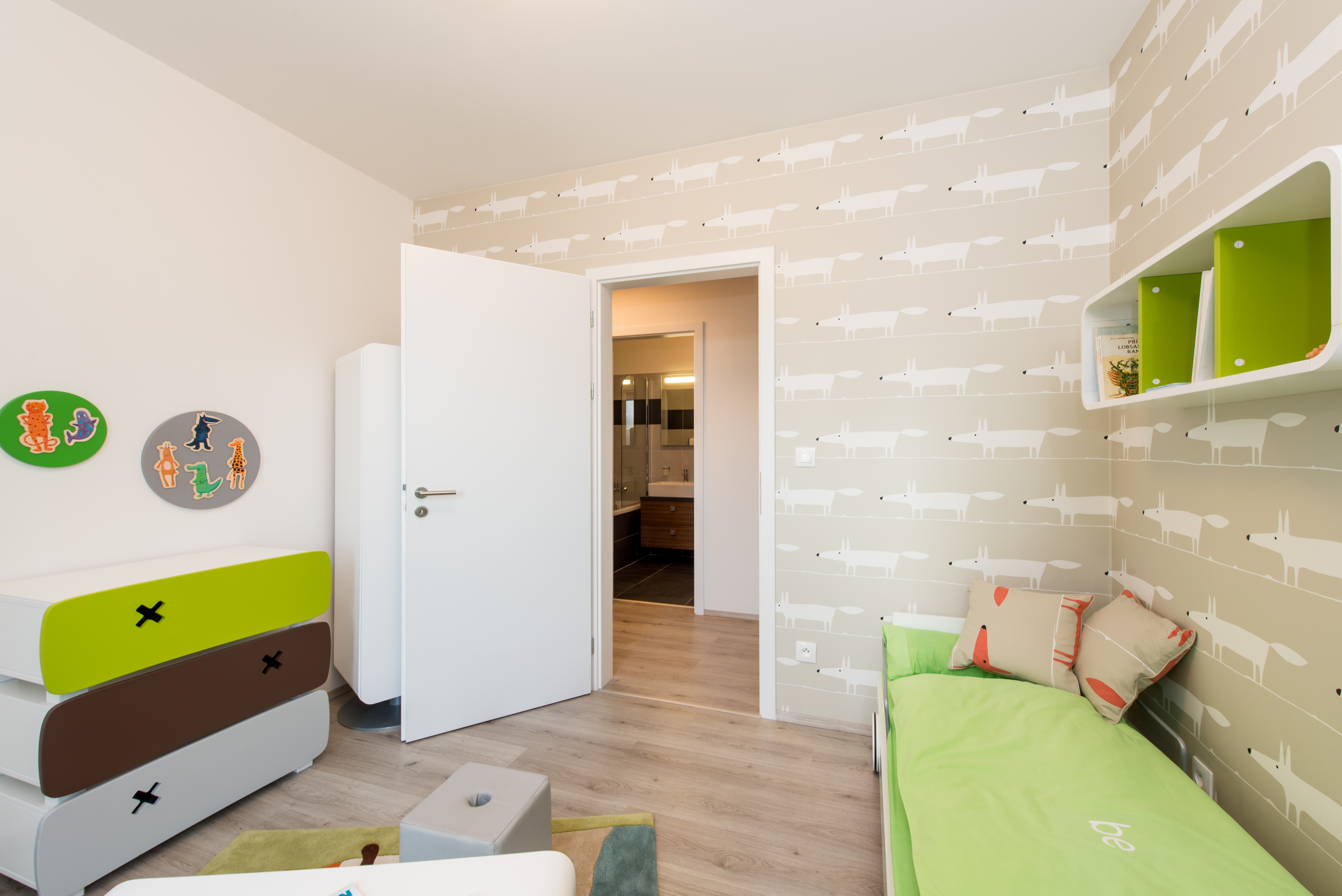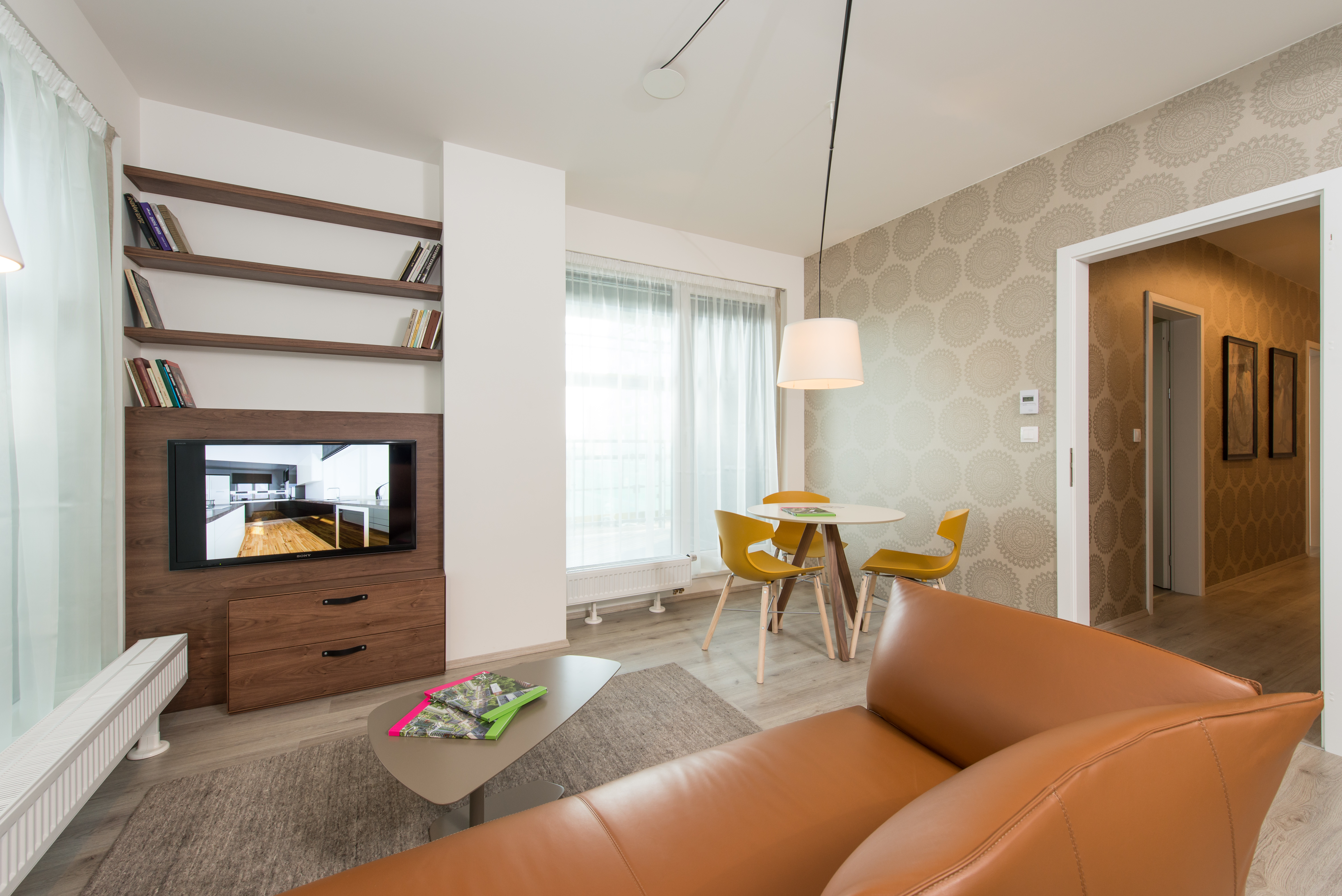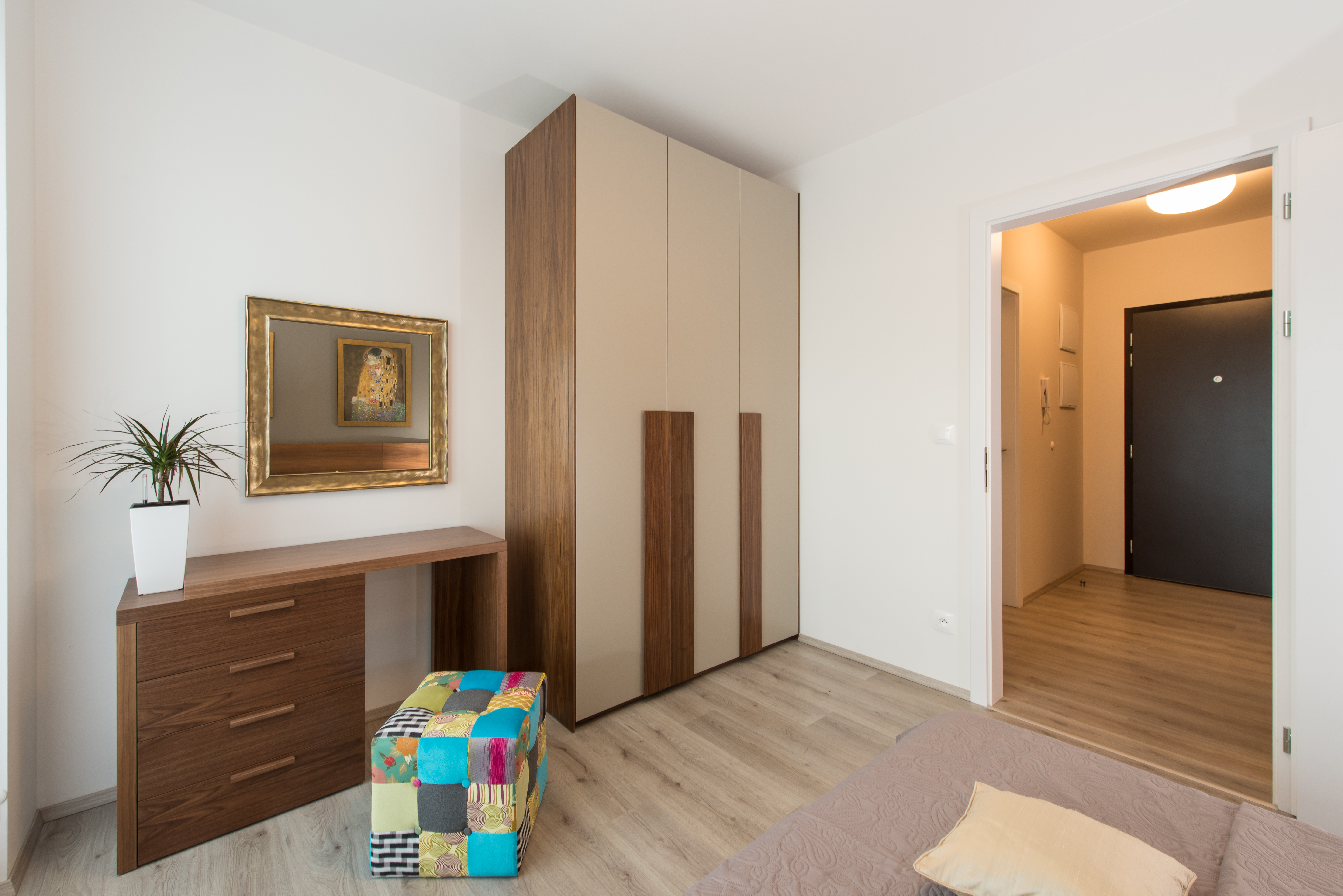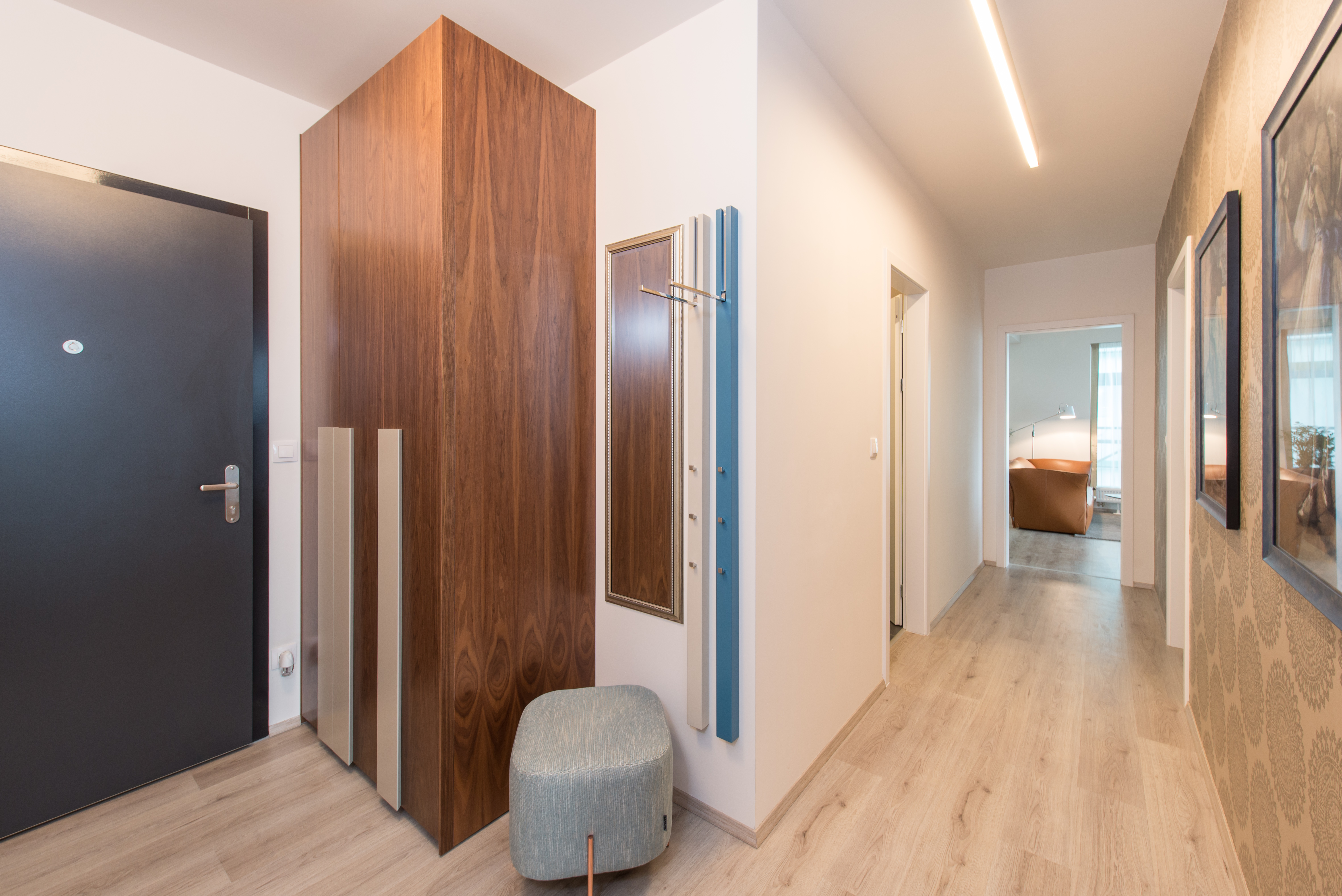 For the company Sidi Group, we furnished a show apartment in the ByTy Malešice project. From the standard selection of floors, doors, and bathrooms, we chose grayish shades so that we could build an interior on this foundation using walnut veneer, complemented by matte lacquers, wallpapers, and colors on the walls and furniture. In the kitchen, there is also a suspended ceiling and an installation false wall. Some furniture pieces, such as the dining table or the furniture for the TV and bathrooms, were custom-made by joiners according to our design. The sofa is in nubuck leather, the coat racks in the entryway are Line by Schönbuch, and the witty Elefant stool in the entryway is by Sancal. The apartment is accessible by arrangement, and we would be happy to present it to you.