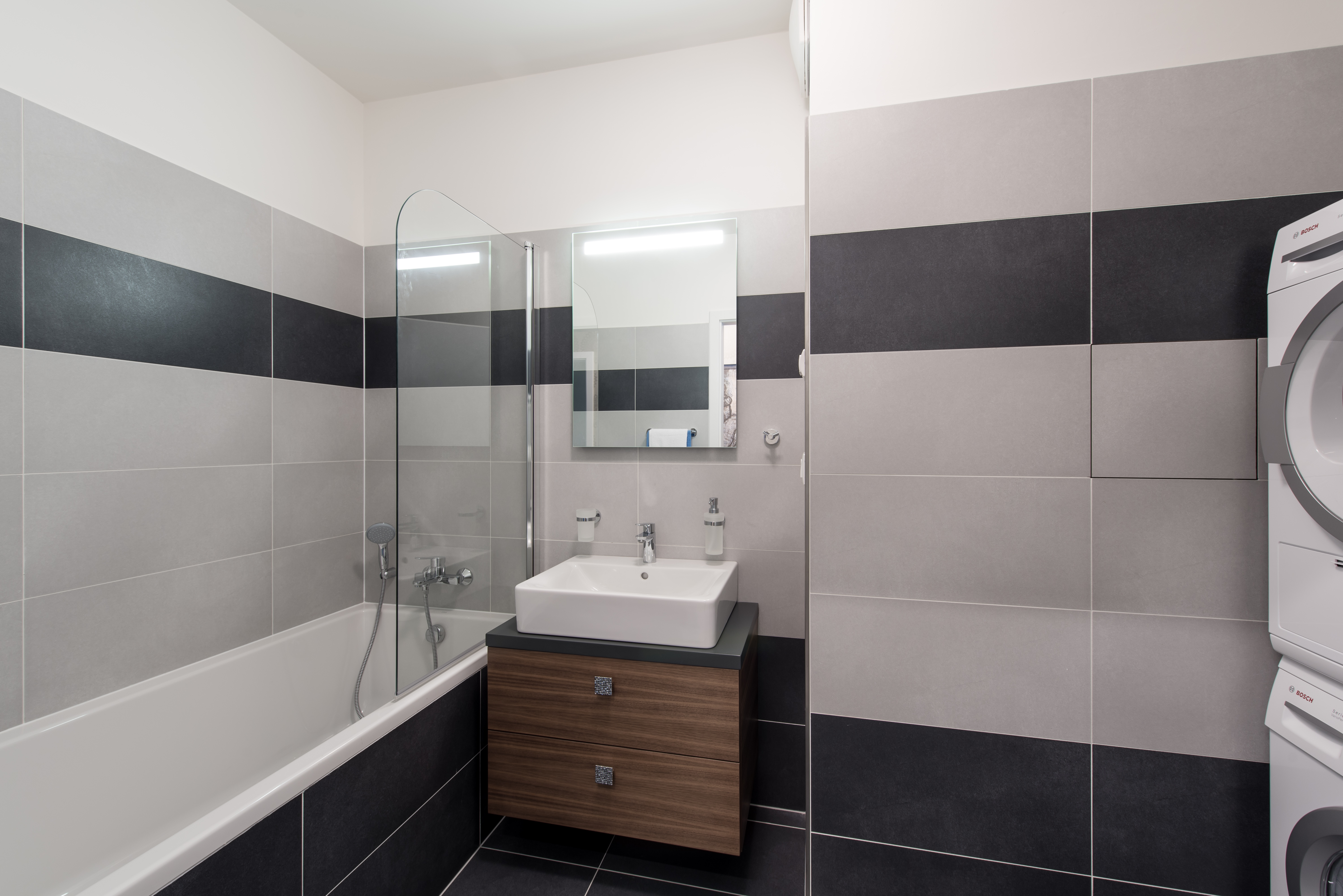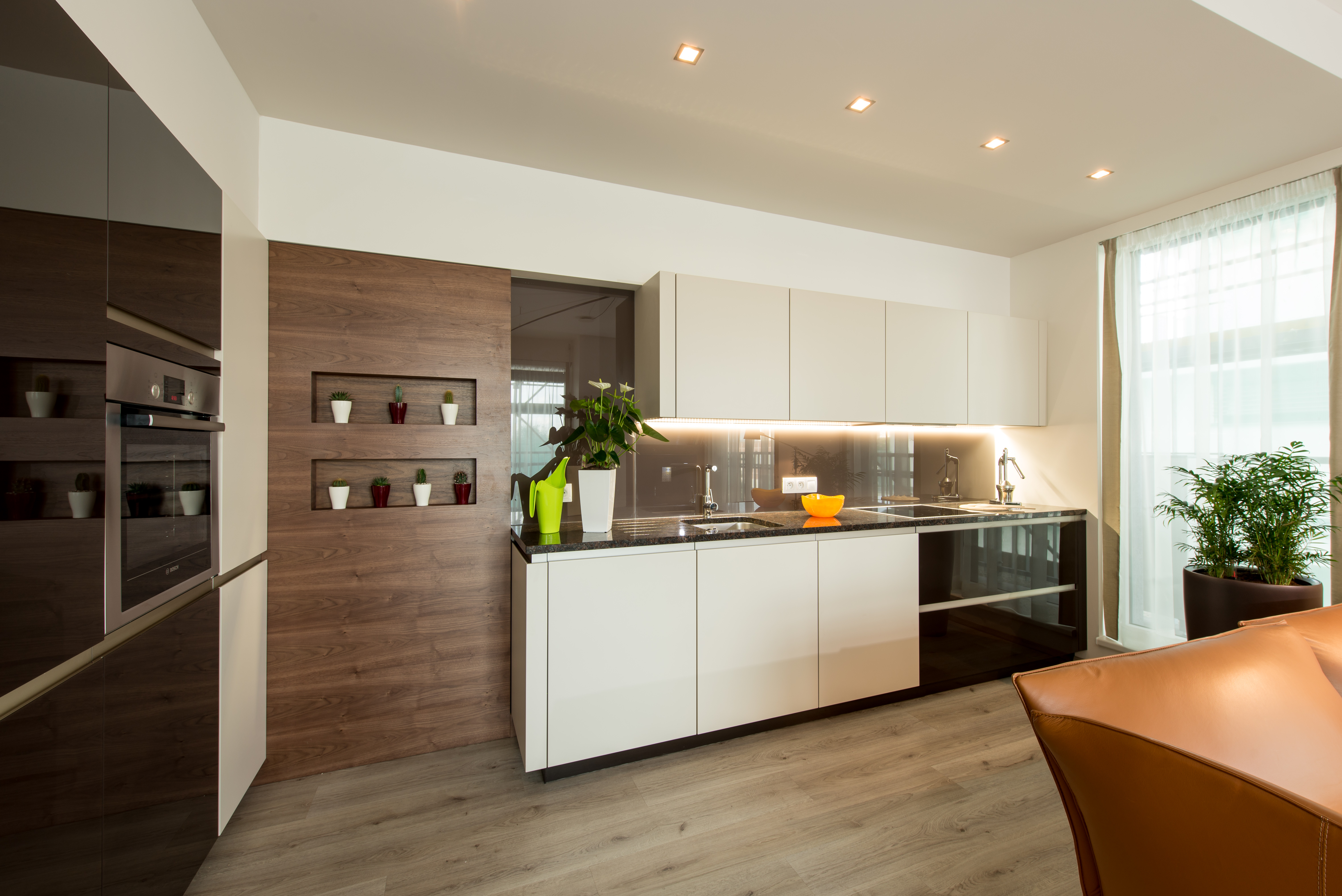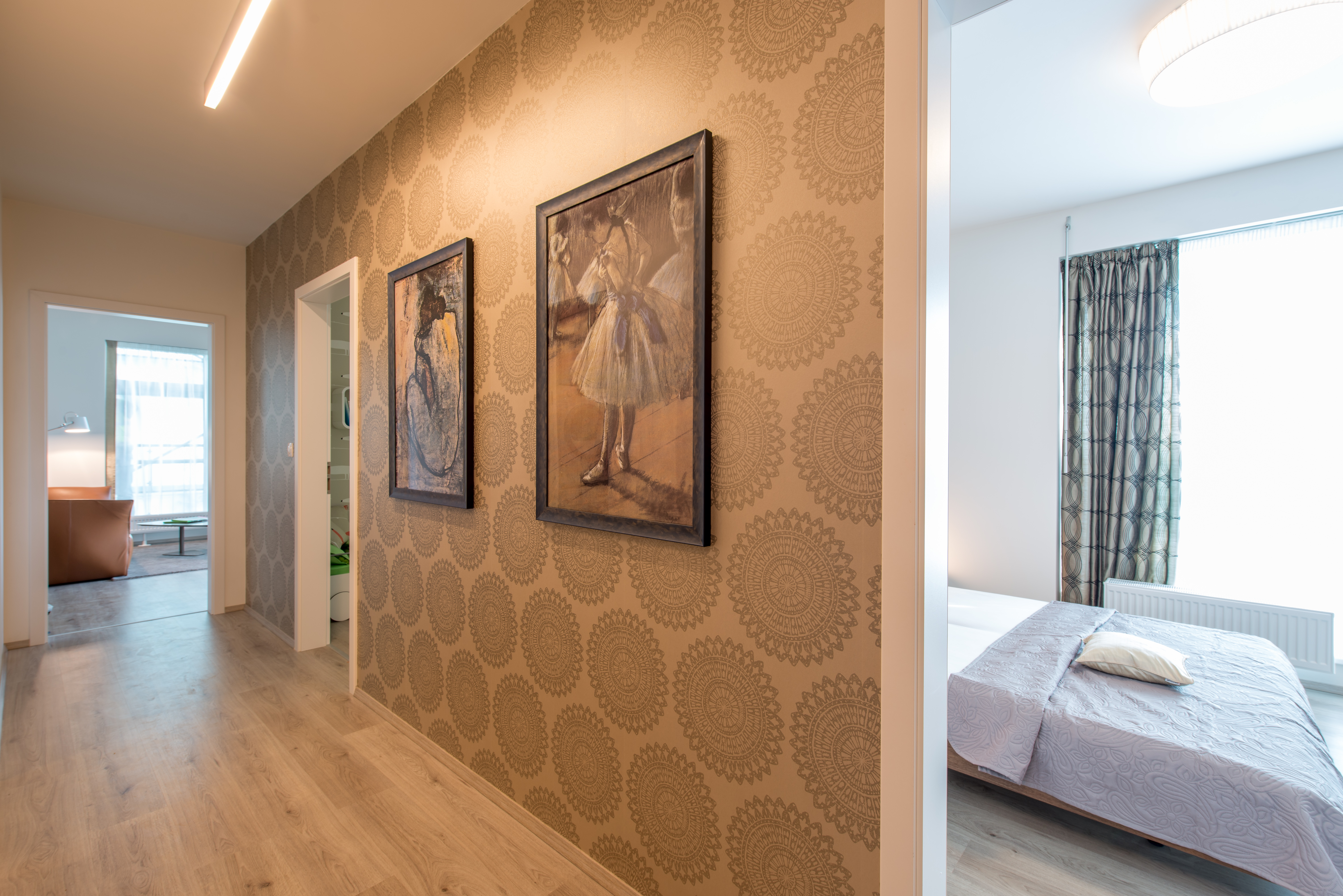 For the company Sidi Group, we furnished a show apartment in the ByTy Malešice project. From the standard selection of floors, doors, and bathrooms, we chose grayish shades so that we could build an interior on this foundation using walnut veneer, complemented by matte lacquers, wallpapers, and colors on the walls and furniture. In the kitchen, there is also a suspended ceiling and an installation false wall. Some furniture pieces, such as the dining table or the furniture for the TV and bathrooms, were custom-made by joiners according to our design. The sofa is in nubuck leather, the coat racks in the entryway are Line by Schönbuch, and the witty Elefant stool in the entryway is by Sancal. The apartment is accessible by arrangement, and we would be happy to present it to you.