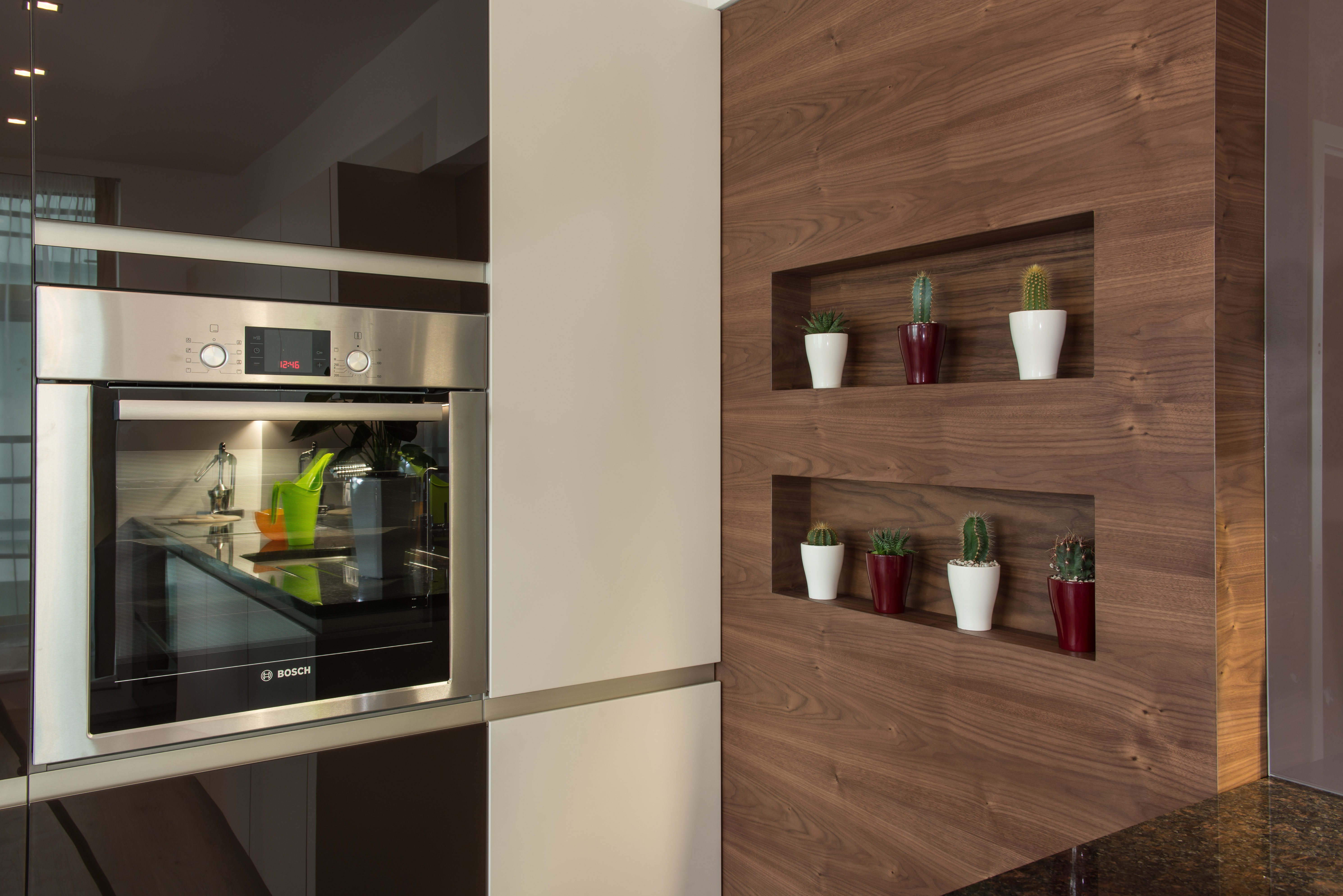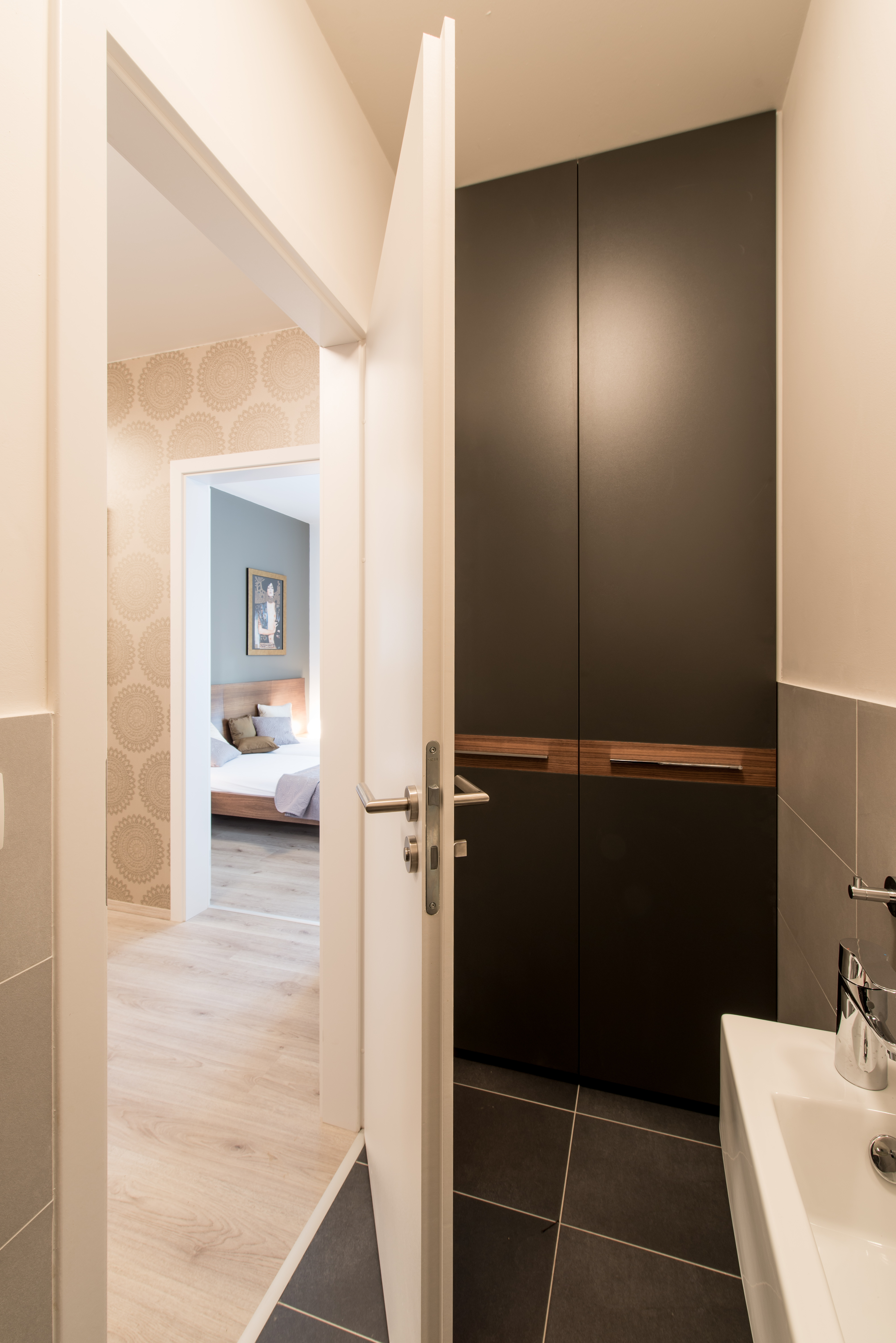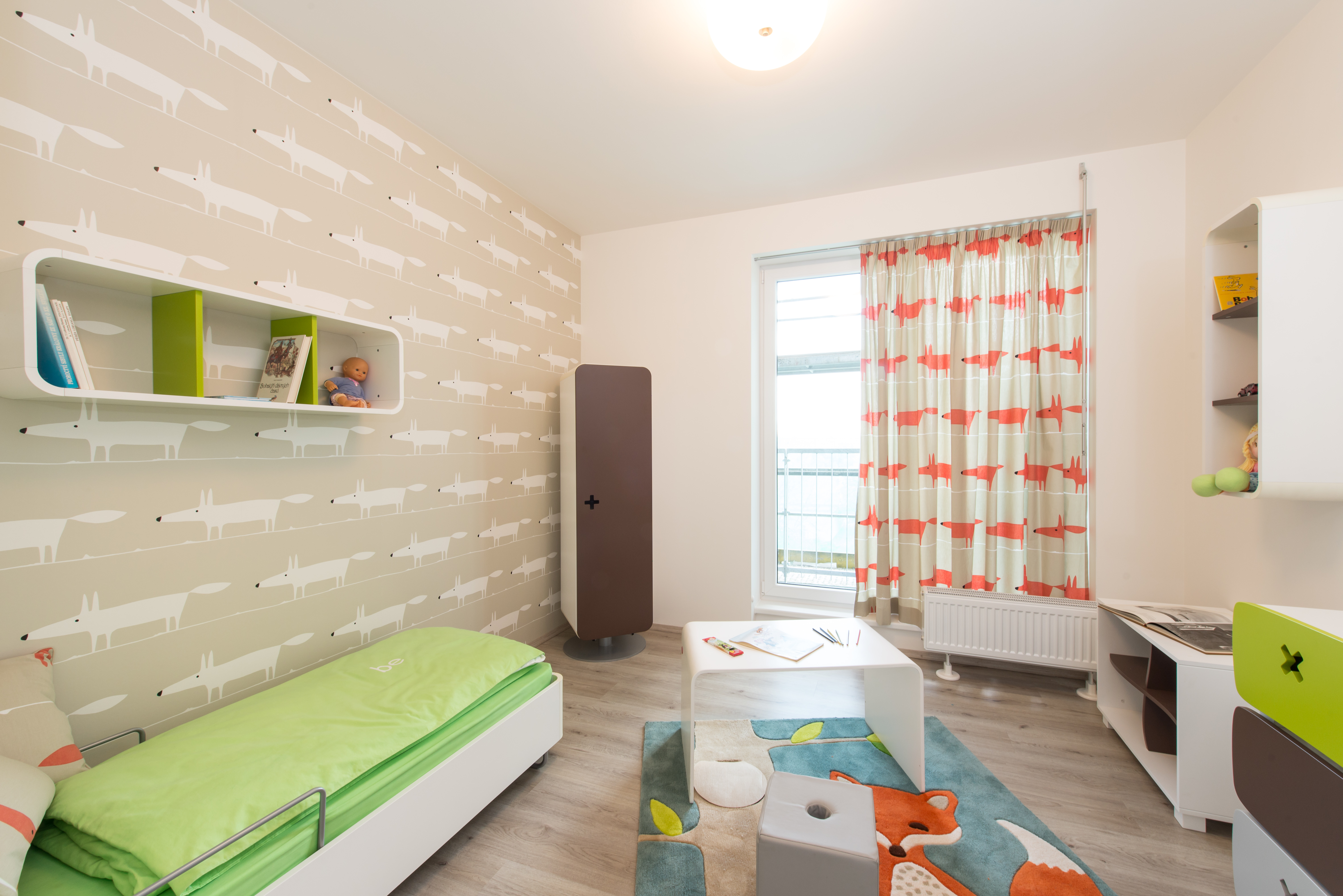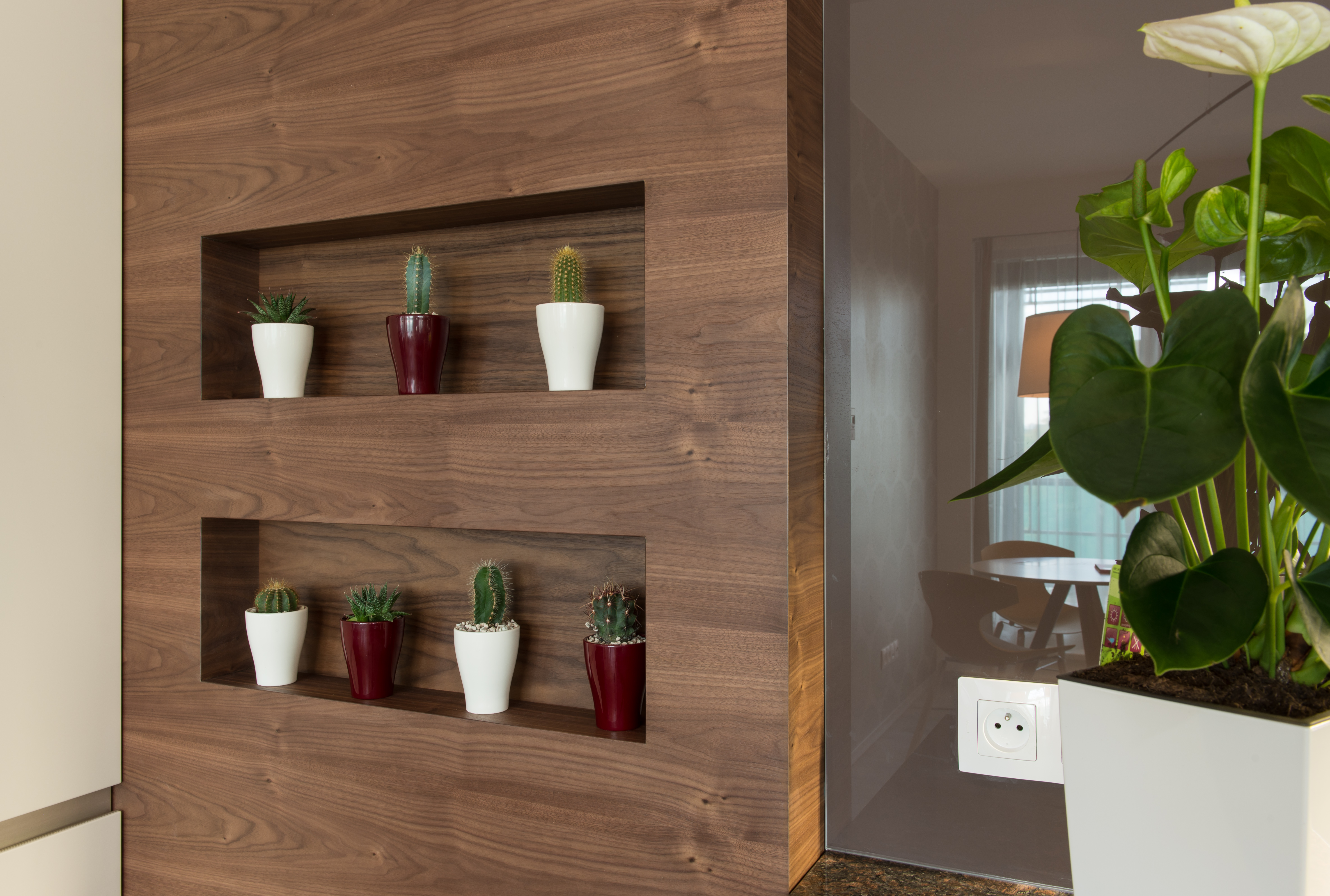 For the company Sidi Group, we furnished a show apartment in the ByTy Malešice project. From the standard selection of floors, doors, and bathrooms, we chose grayish shades so that we could build an interior on this foundation using walnut veneer, complemented by matte lacquers, wallpapers, and colors on the walls and furniture. In the kitchen, there is also a suspended ceiling and an installation false wall. Some furniture pieces, such as the dining table or the furniture for the TV and bathrooms, were custom-made by joiners according to our design. The sofa is in nubuck leather, the coat racks in the entryway are Line by Schönbuch, and the witty Elefant stool in the entryway is by Sancal. The apartment is accessible by arrangement, and we would be happy to present it to you.