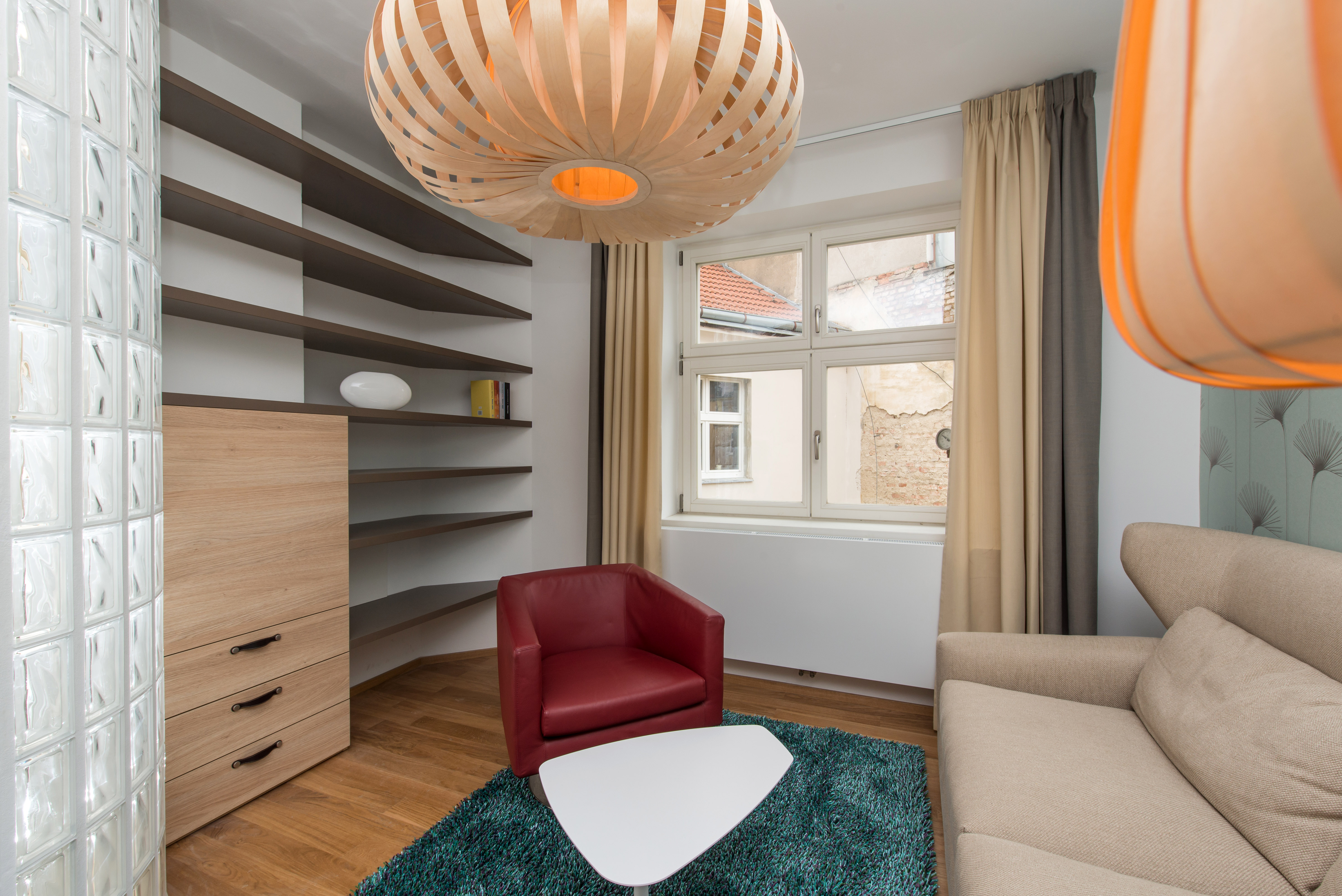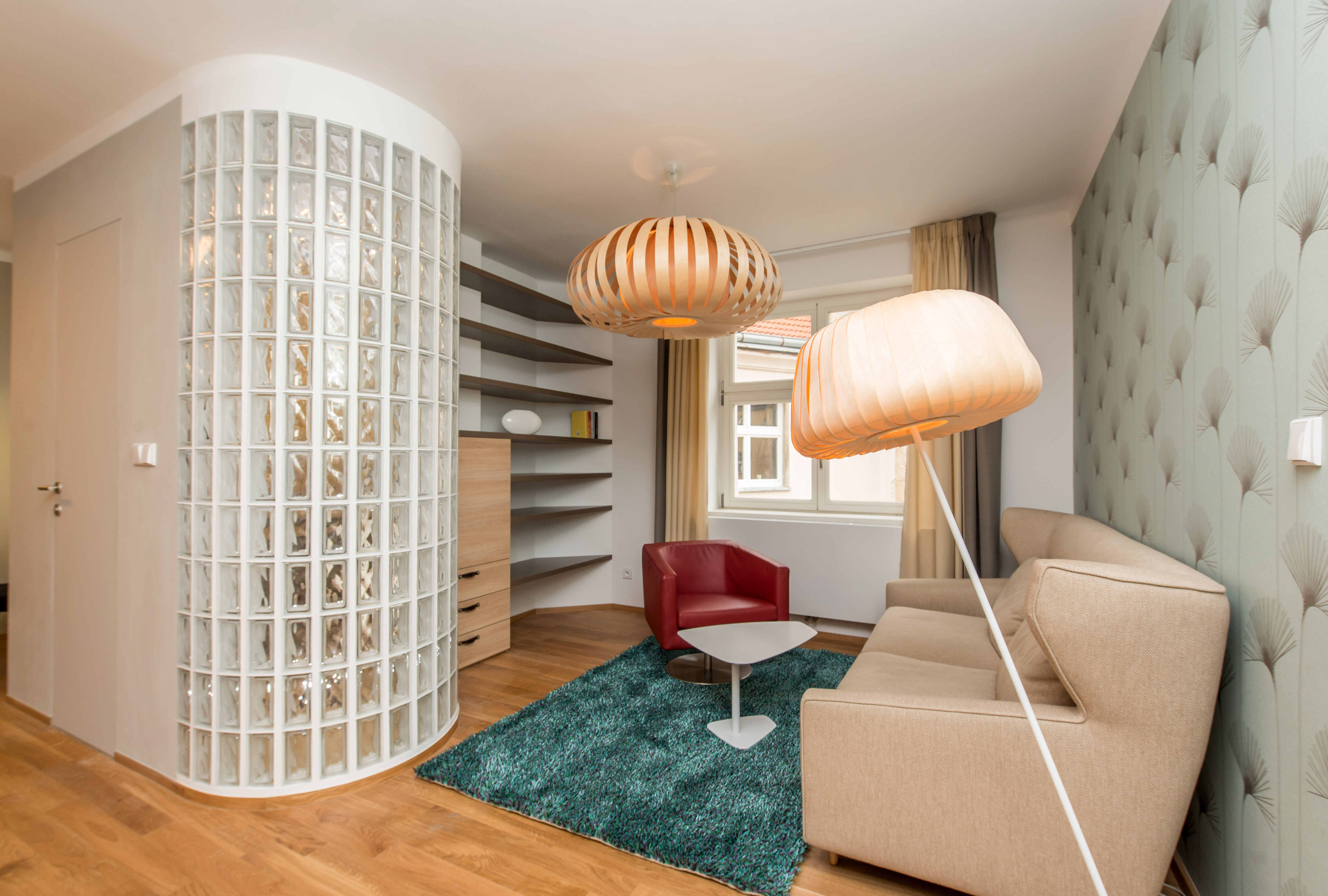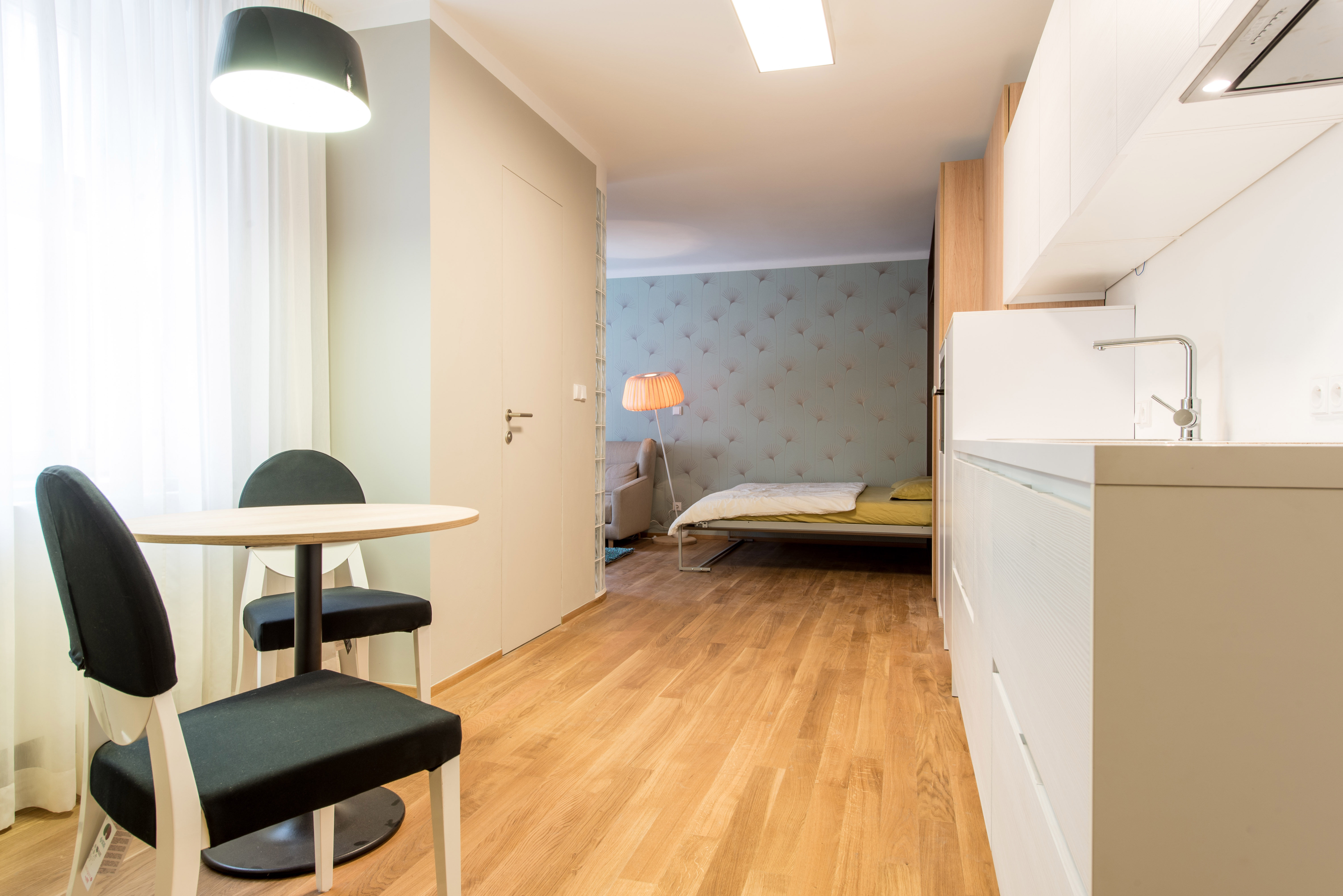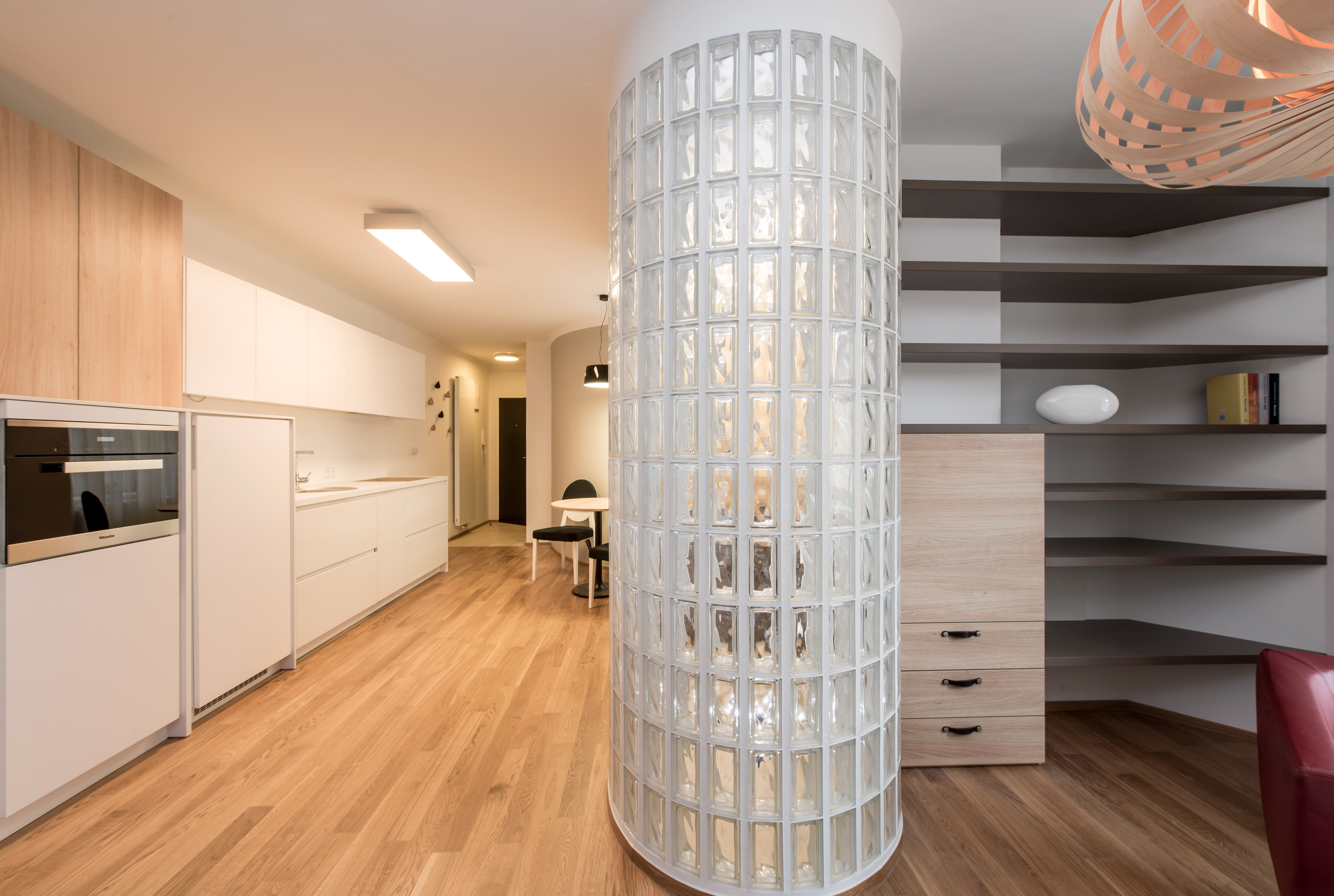 Complete reconstruction of a small apartment in Prague. We demolished unnecessary partitions, replaced the windows with new wooden ones, and restored the original material to the floors: oak planks. Due to the complicated shape of the apartment, solving the bathroom was a challenge. We copied one of the rounded walls and translated the curve into glass blocks (luxfers) that form the shower enclosure. Given the size of the apartment and the need for space saving, a fold-down bed with a full-sized mattress is used. Balsa wood light fixtures, a colorful dandelion wallpaper, and witty wooden hangers in the entryway give the apartment an original character.