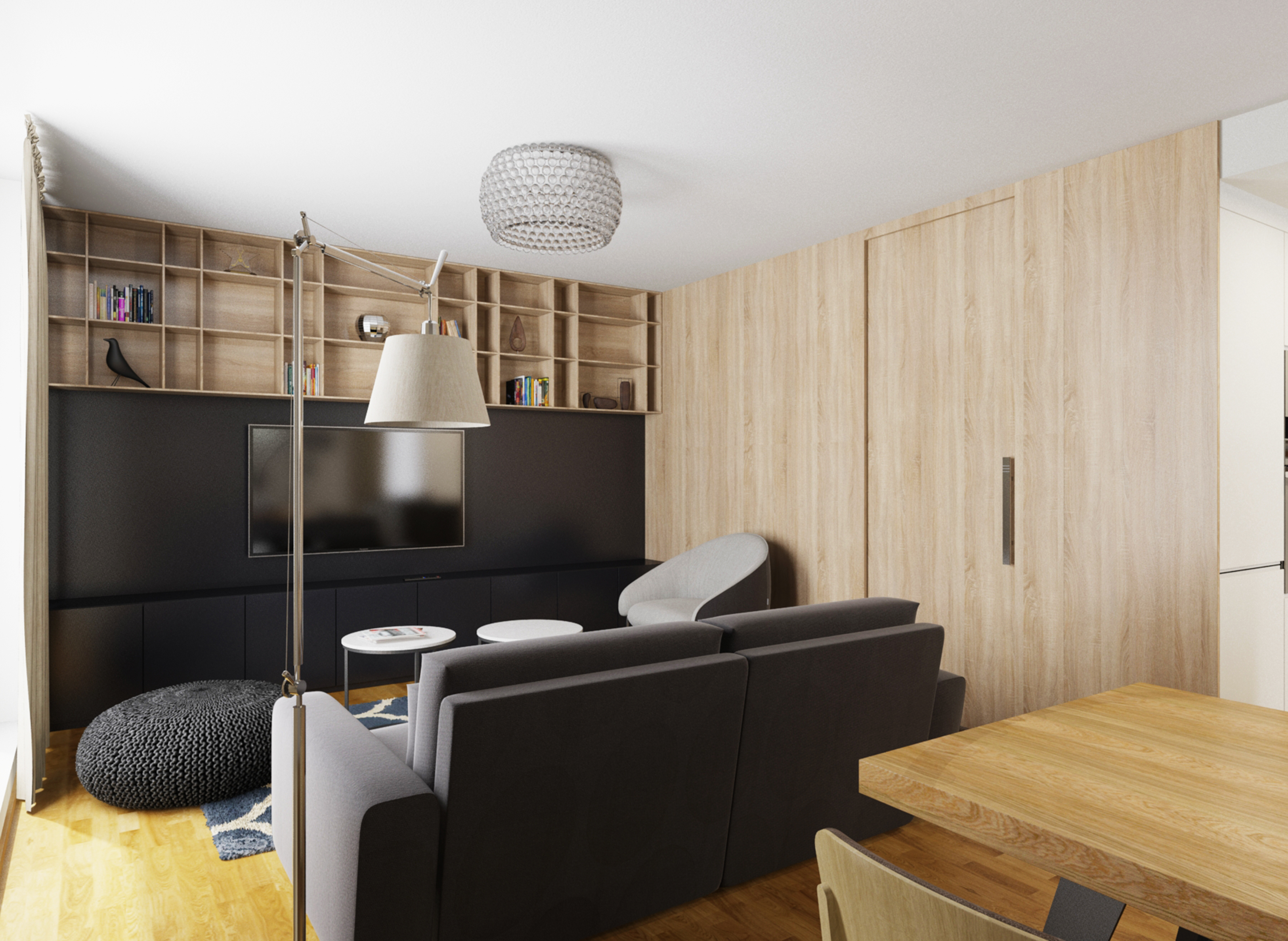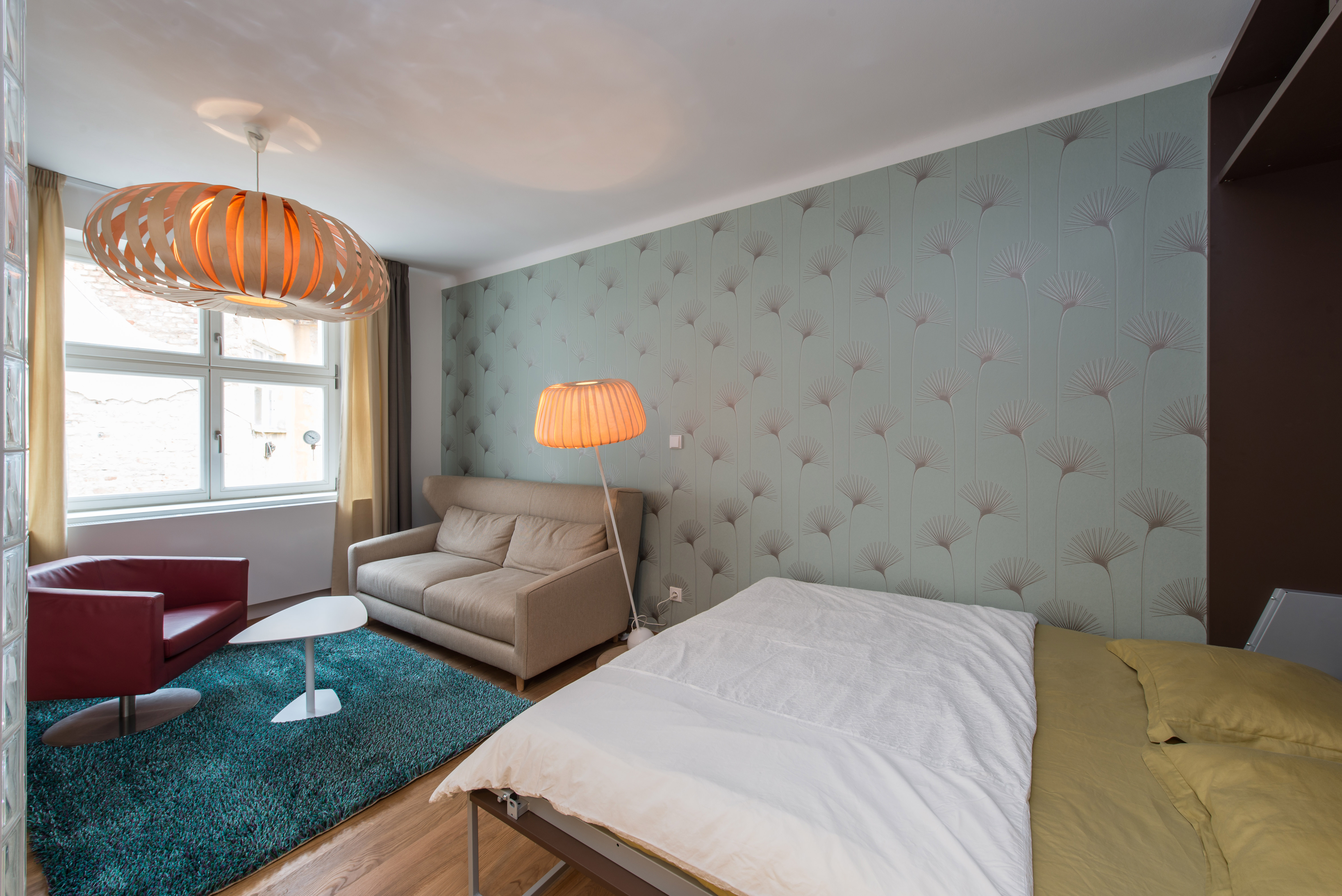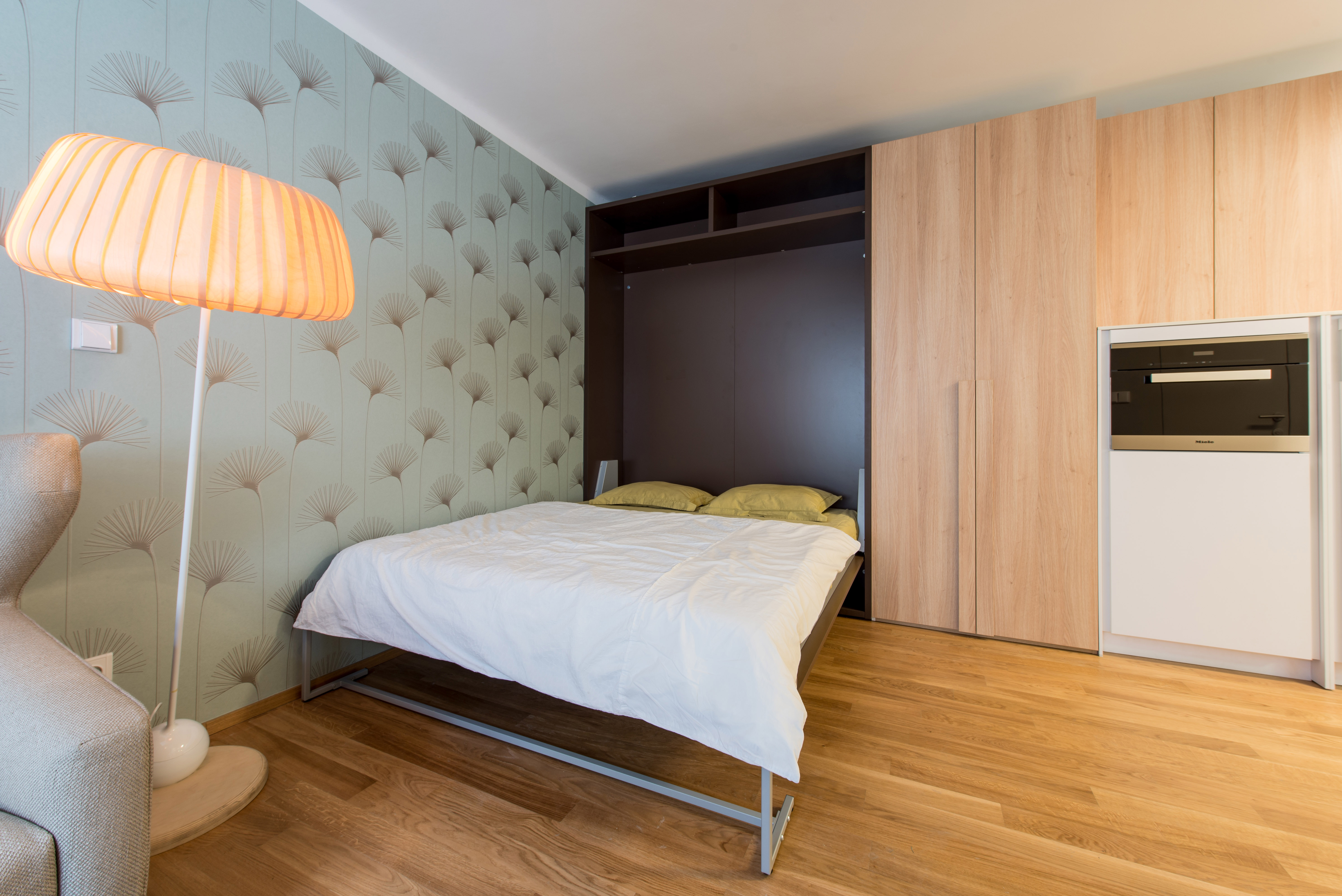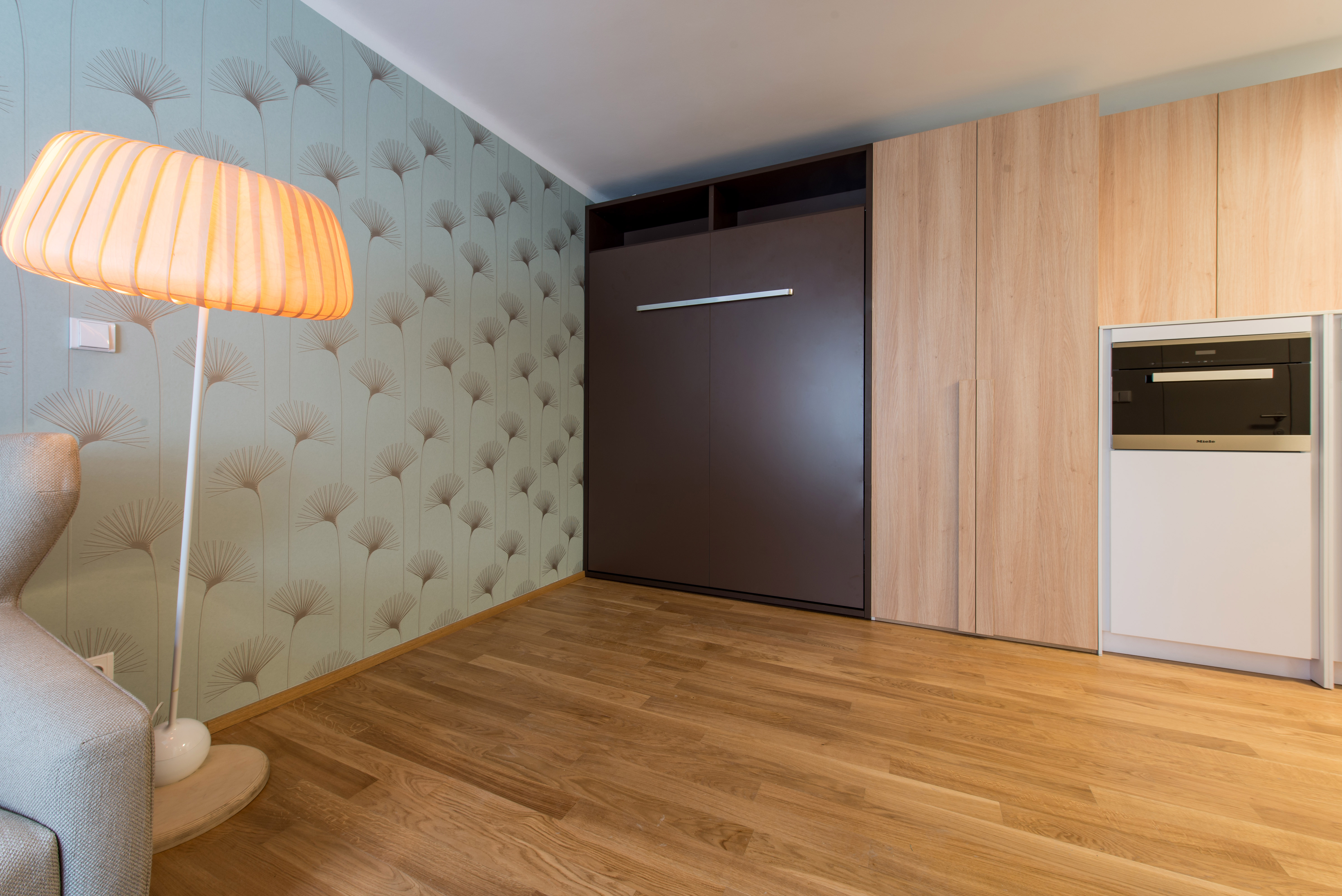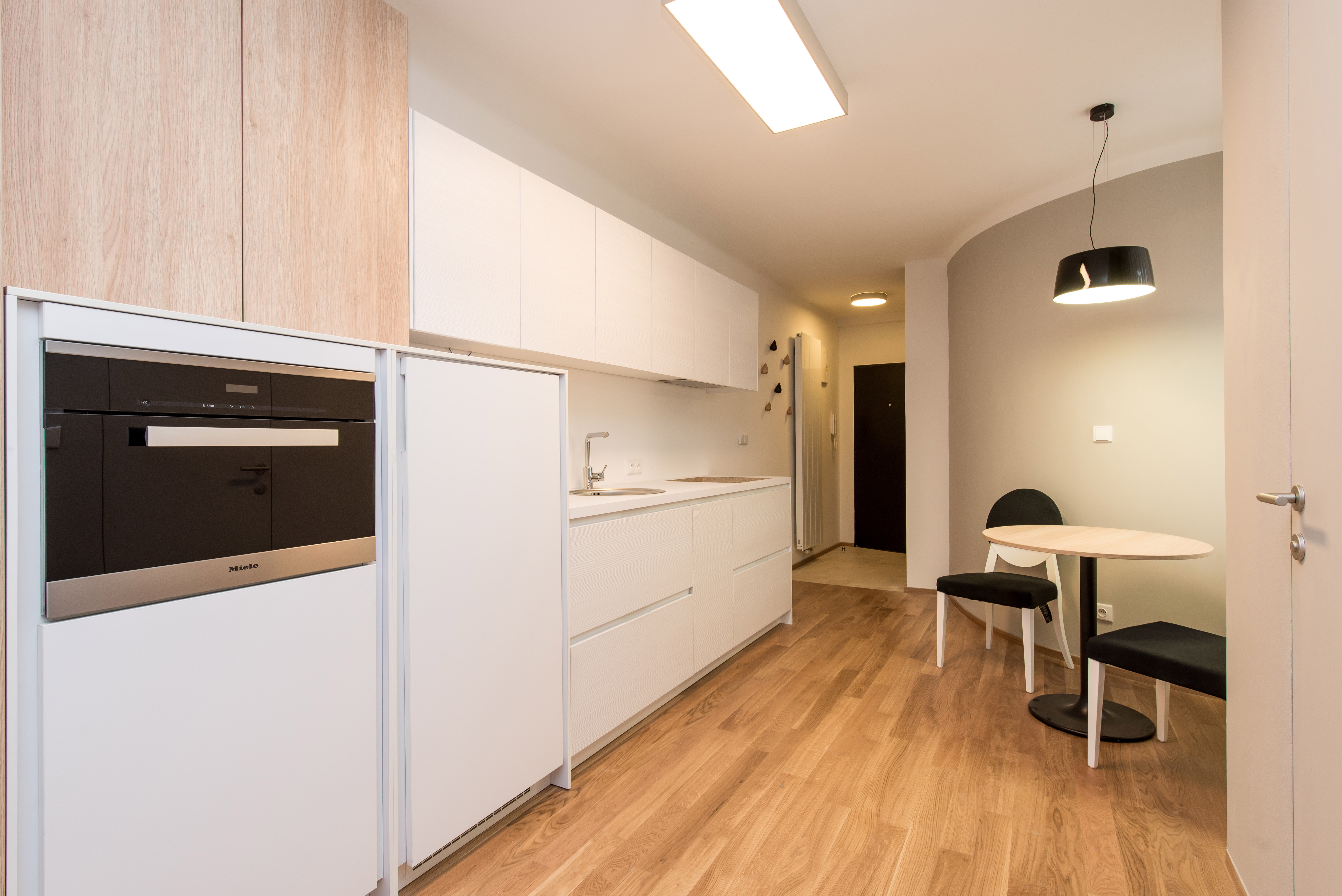 Complete reconstruction of a small apartment in Prague. We demolished unnecessary partitions, replaced the windows with new wooden ones, and restored the original material to the floors: oak planks. Due to the complicated shape of the apartment, solving the bathroom was a challenge. We copied one of the rounded walls and translated the curve into glass blocks (luxfers) that form the shower enclosure. Given the size of the apartment and the need for space saving, a fold-down bed with a full-sized mattress is used. Balsa wood light fixtures, a colorful dandelion wallpaper, and witty wooden hangers in the entryway give the apartment an original character.