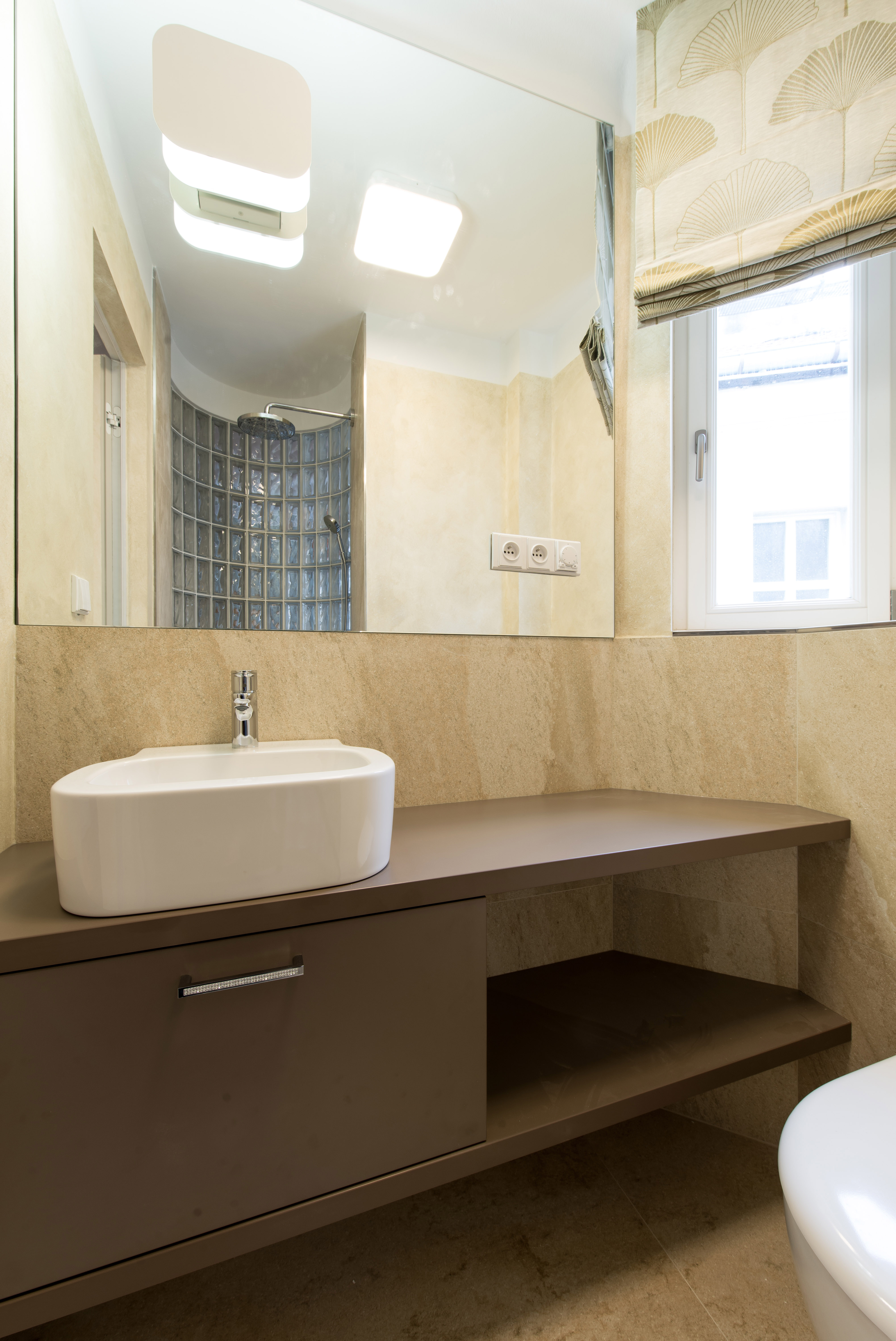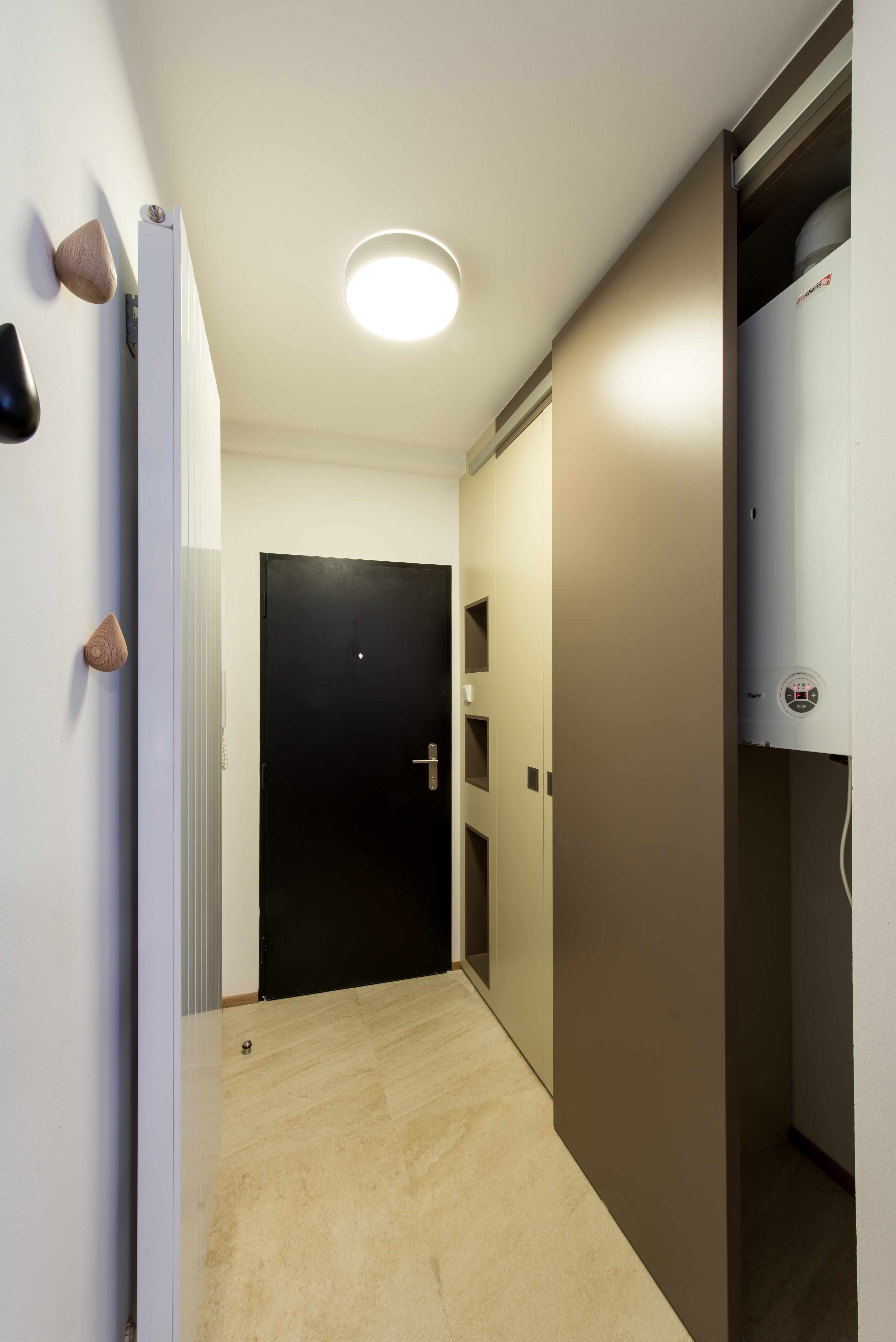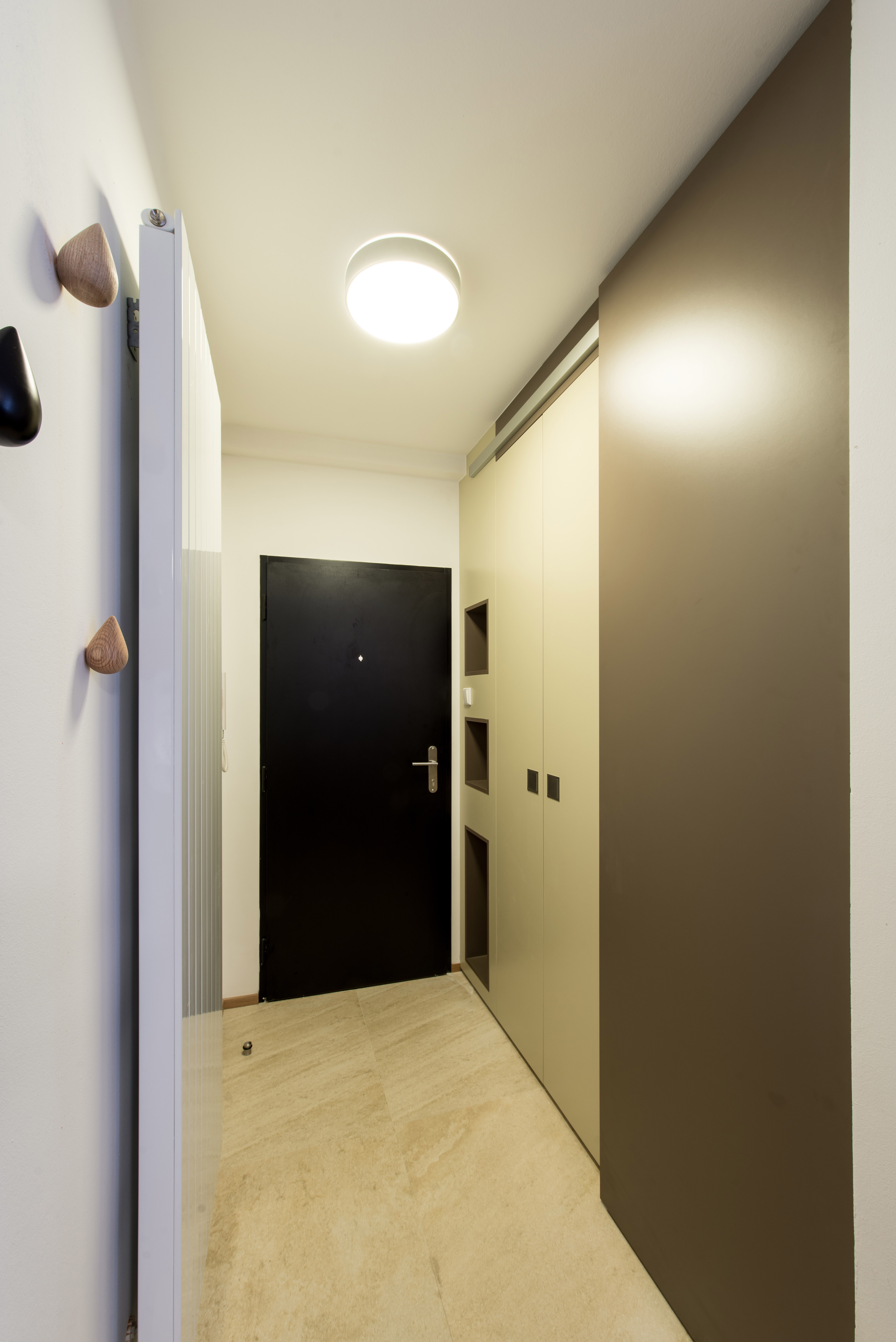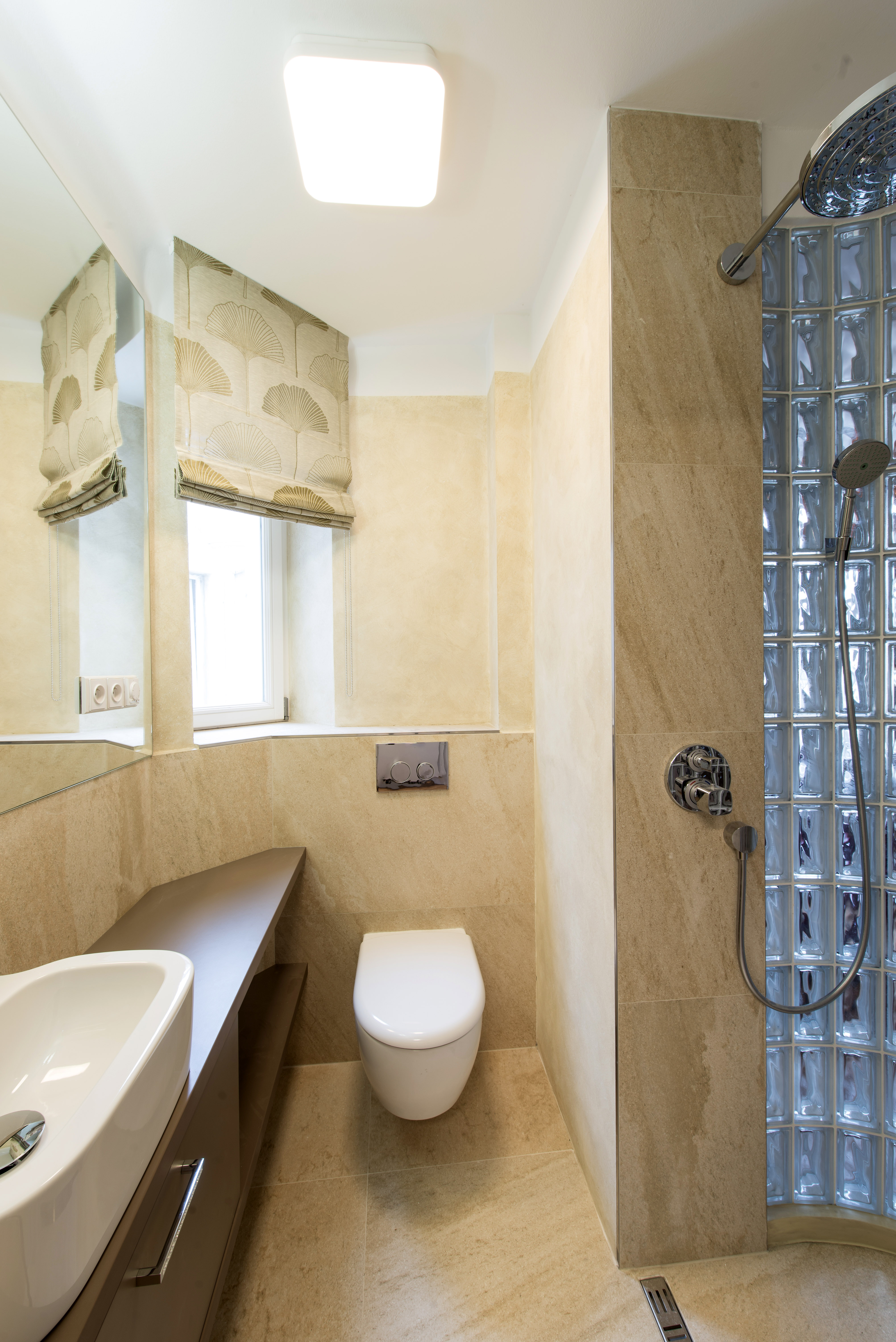 Complete reconstruction of a small apartment in Prague. We demolished unnecessary partitions, replaced the windows with new wooden ones, and restored the original material to the floors: oak planks. Due to the complicated shape of the apartment, solving the bathroom was a challenge. We copied one of the rounded walls and translated the curve into glass blocks (luxfers) that form the shower enclosure. Given the size of the apartment and the need for space saving, a fold-down bed with a full-sized mattress is used. Balsa wood light fixtures, a colorful dandelion wallpaper, and witty wooden hangers in the entryway give the apartment an original character.