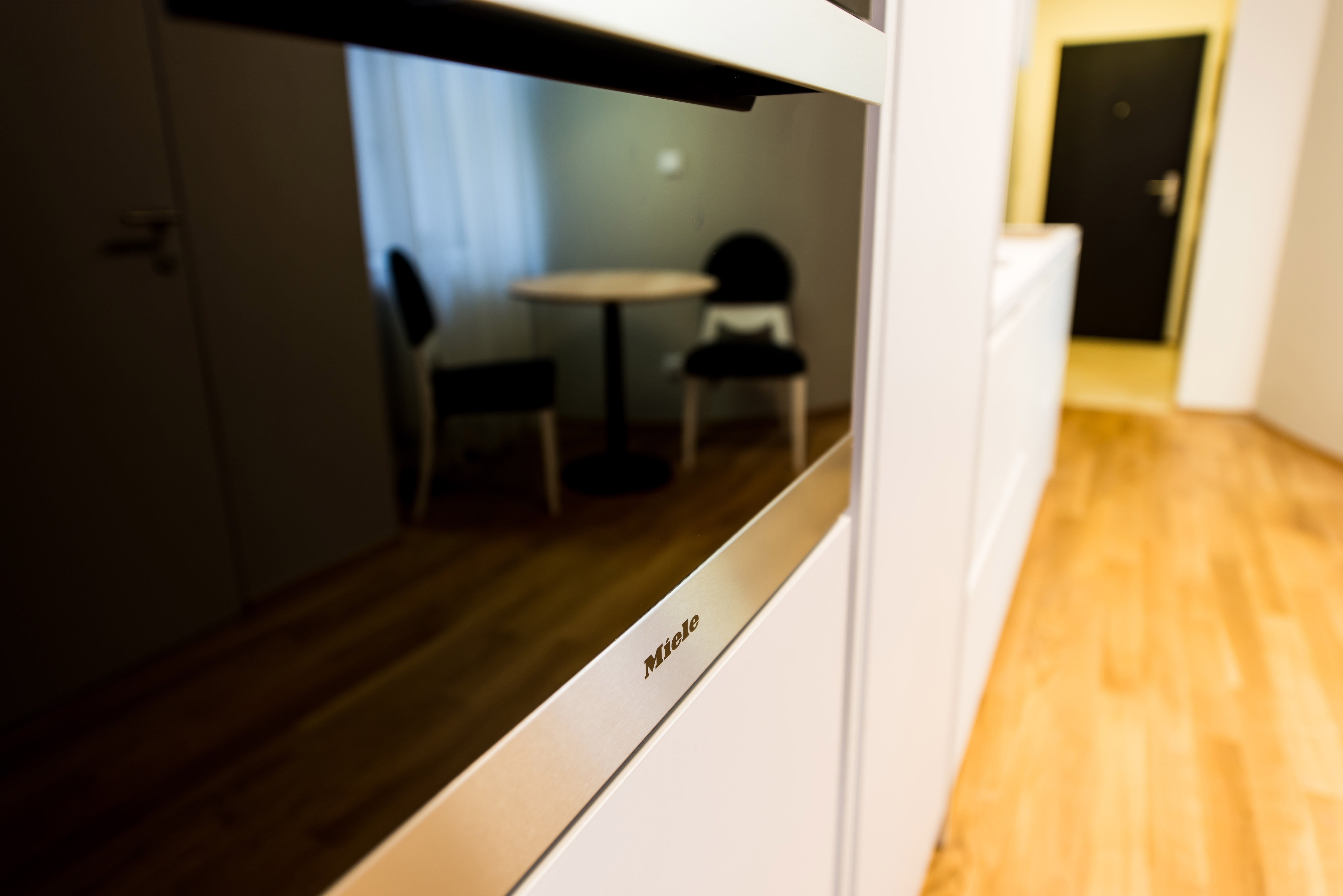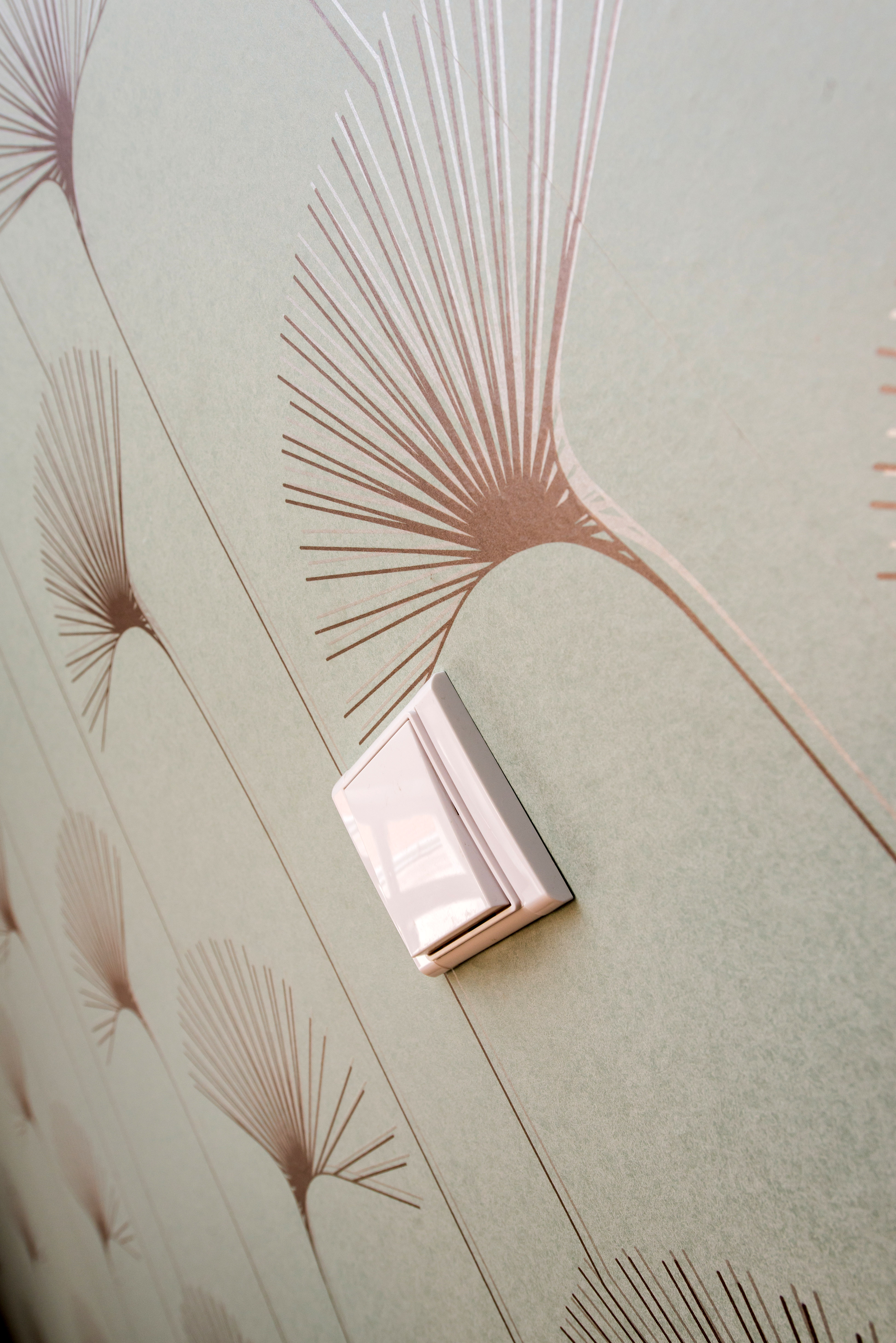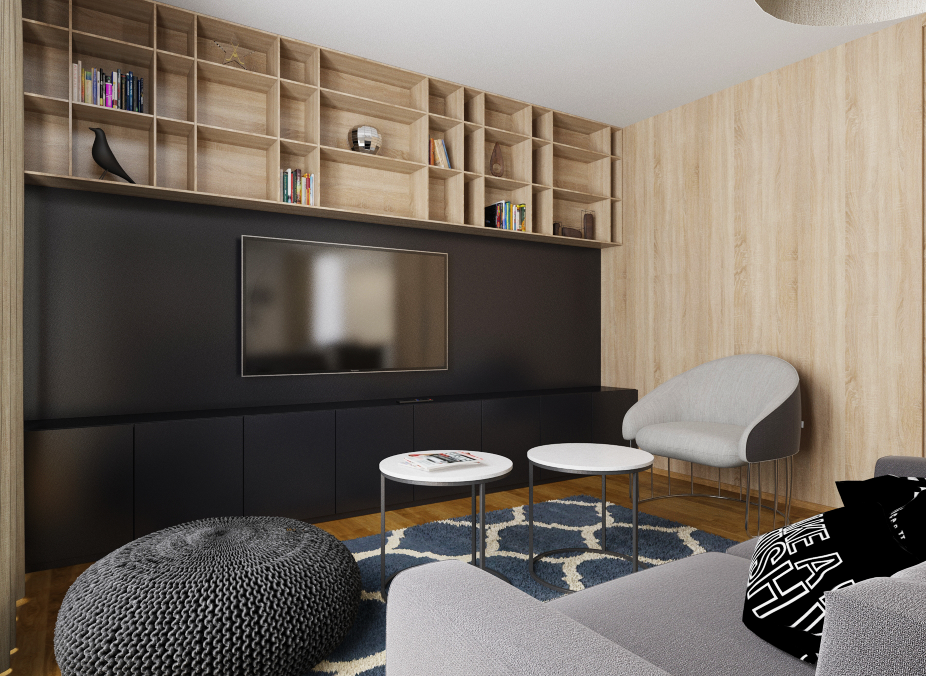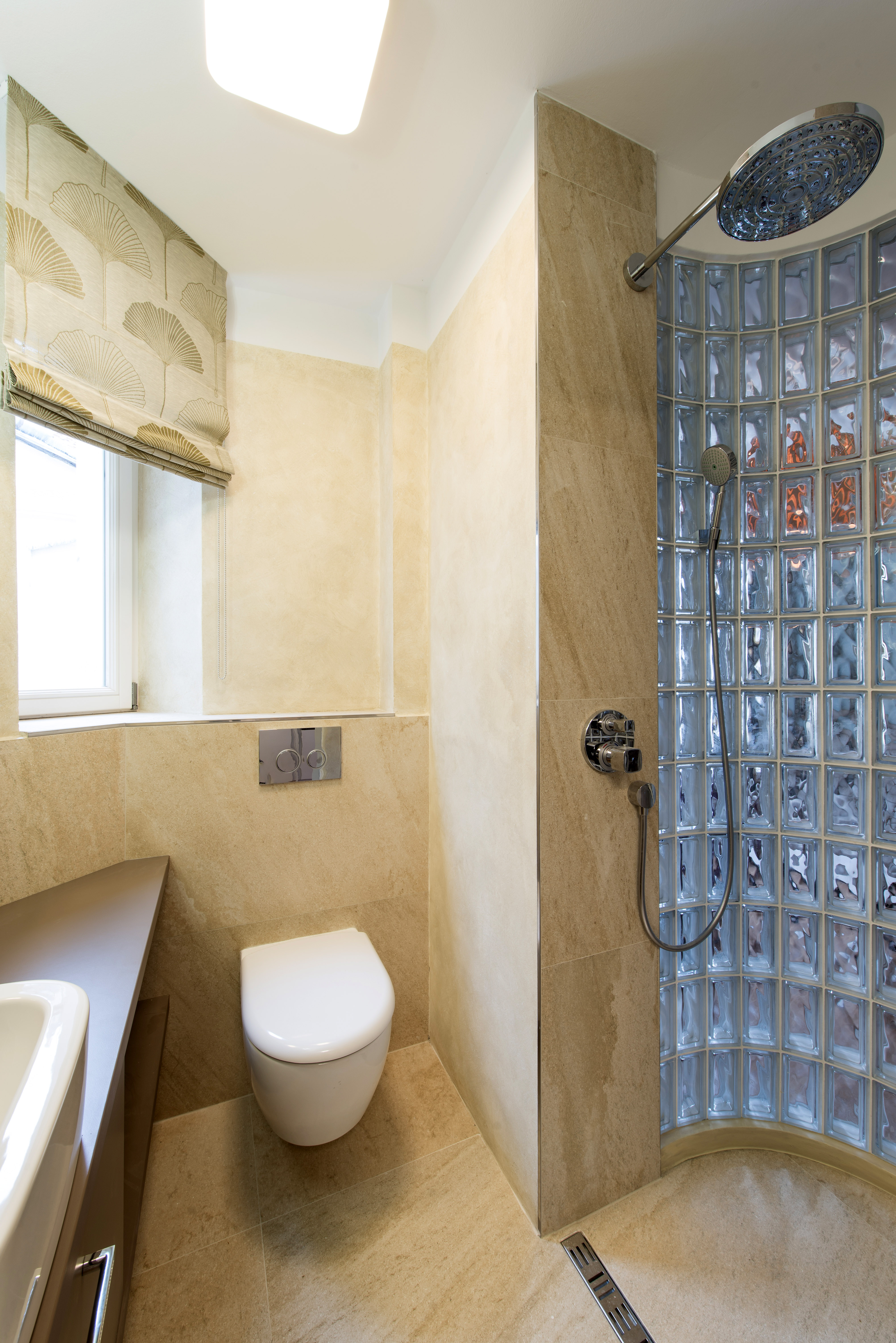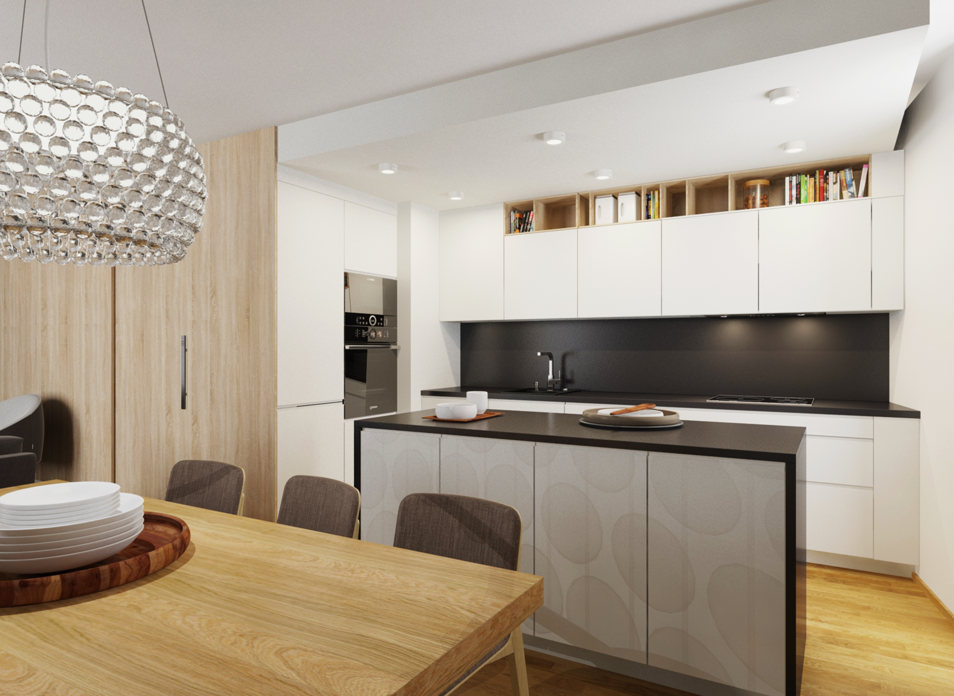 Complete reconstruction of a small apartment in Prague. We demolished unnecessary partitions, replaced the windows with new wooden ones, and restored the original material to the floors: oak planks. Due to the complicated shape of the apartment, solving the bathroom was a challenge. We copied one of the rounded walls and translated the curve into glass blocks (luxfers) that form the shower enclosure. Given the size of the apartment and the need for space saving, a fold-down bed with a full-sized mattress is used. Balsa wood light fixtures, a colorful dandelion wallpaper, and witty wooden hangers in the entryway give the apartment an original character.